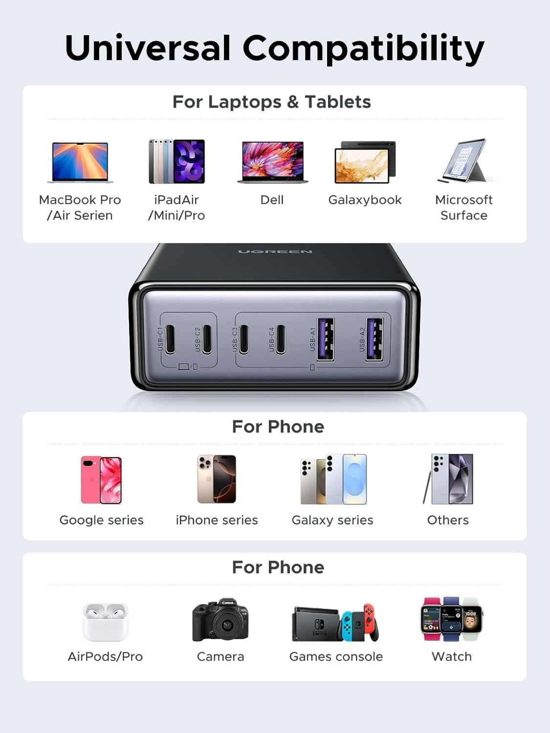 6-in-1 Fast Charging Hub – Features 4 USB-C and 2 USB-A ports, letting you fast charge up to 6 devices at once—ideal for laptops, tablets, phones, headphones, Switch, and more.