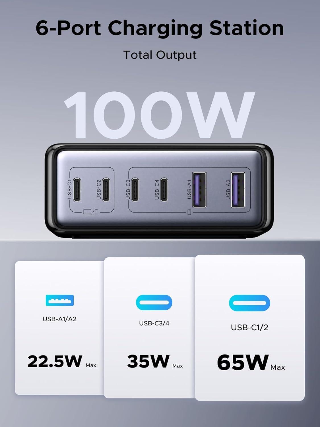 UGREEN 100W USB C Charging Station, 6-Port GaN Desktop Charger with 4 USB-C & 2 USB-A, Smart Power Distribution for MacBook Pro/Air, Dell XPS, iPad, iPhone 17/16/15, Galaxy S25/S24, Pixel 10/9