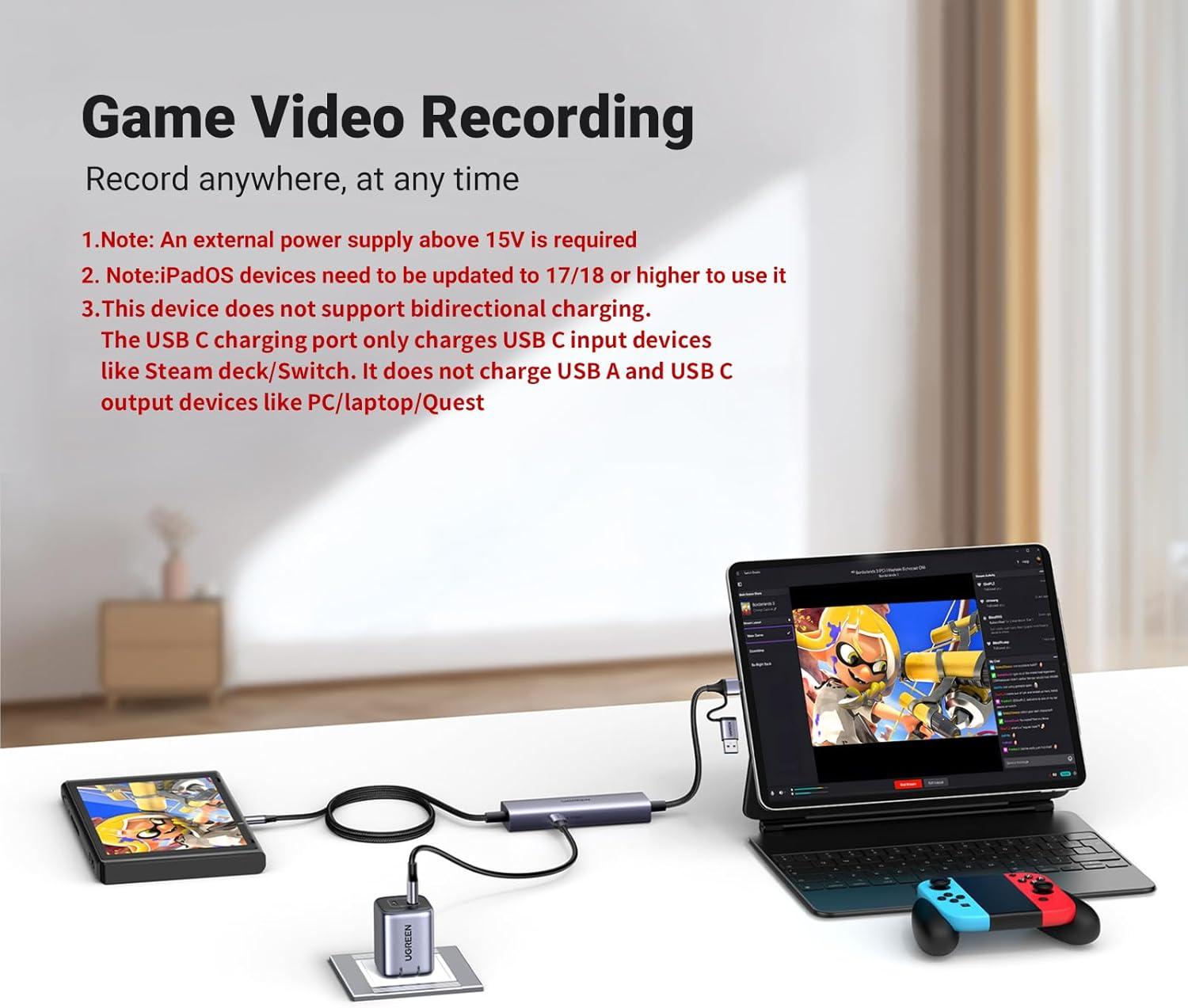 100W Fast Charging: The Type C capture card for iPad supports PD100W fast charge and PD3.0 fast charge protocol. You can stream the game and charge the Switch or Steam deck simultaneously. Say goodbye to battery anxiety! Note: This device does not support bidirectional charging. The USB C charging port only charges USB C input devices like Steam deck/switch. It does not charge USB A and USB C output devices like PC/laptop/Quest3. Note: An external power supply above 15V is required