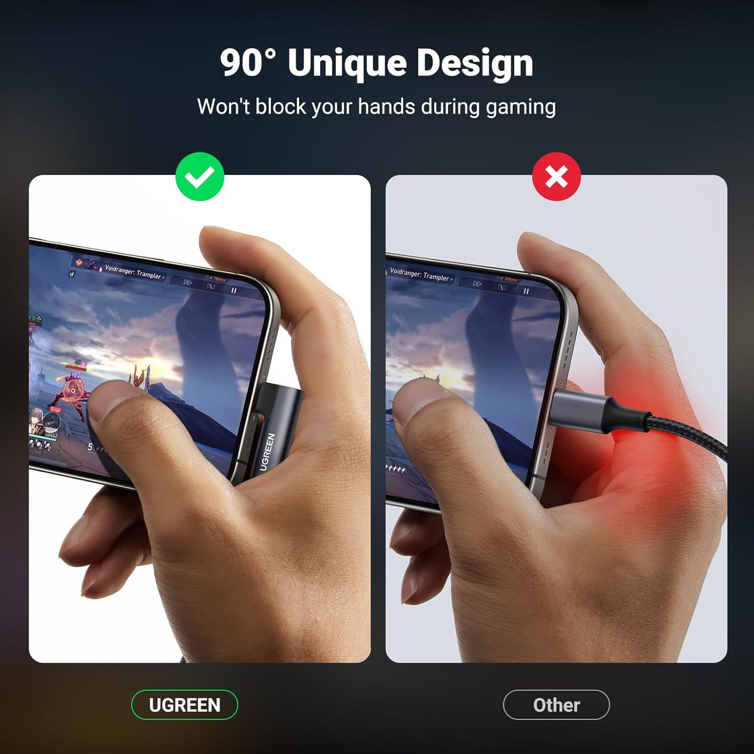 Exclusive 90° Angled Deisgn: With 90-degree right angle ergonomics design, UGREEN Right-Angle USB C to 3.5mm Audio Adapter keeps everything out of the way during gaming, watching movies, texting, and the headphone cable doesn't easily get pulled out, It helps prevent your cables from being damaged and convenient and comfortable to use