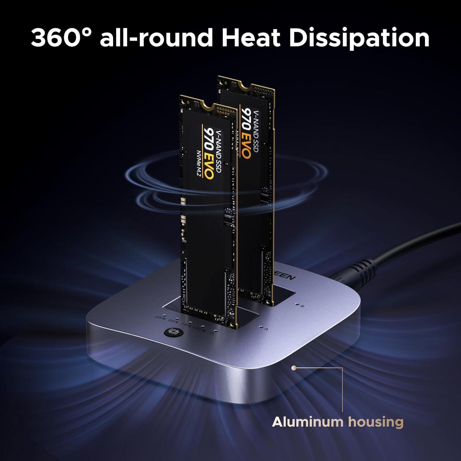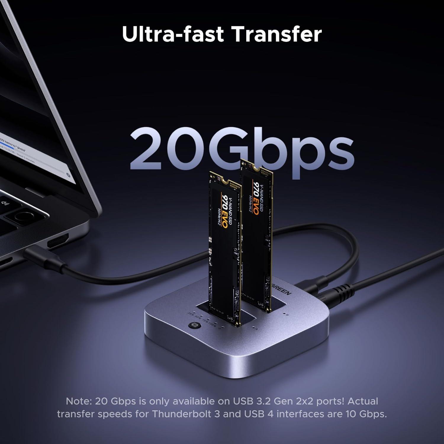 imageUGREEN 20Gbps Dual Bay SSD Cloner NVMe EnclosureUSB32 Gen 2X2 ToolFree USB Adapter M2 Docking Station for M Key PCIE NVMe SSD Reader Supports Offline Clone Up to 16TB