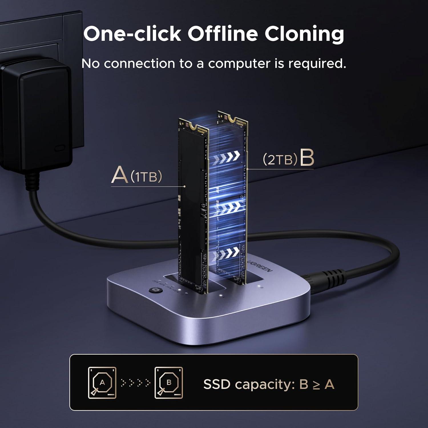 One-Click Offline Cloning, No PC Required:Features a single-button offline clone function for fast disk duplication. Simply insert source and target SSDs and start cloning.Note: Cloning requires drive B to be at least equal to drive A.