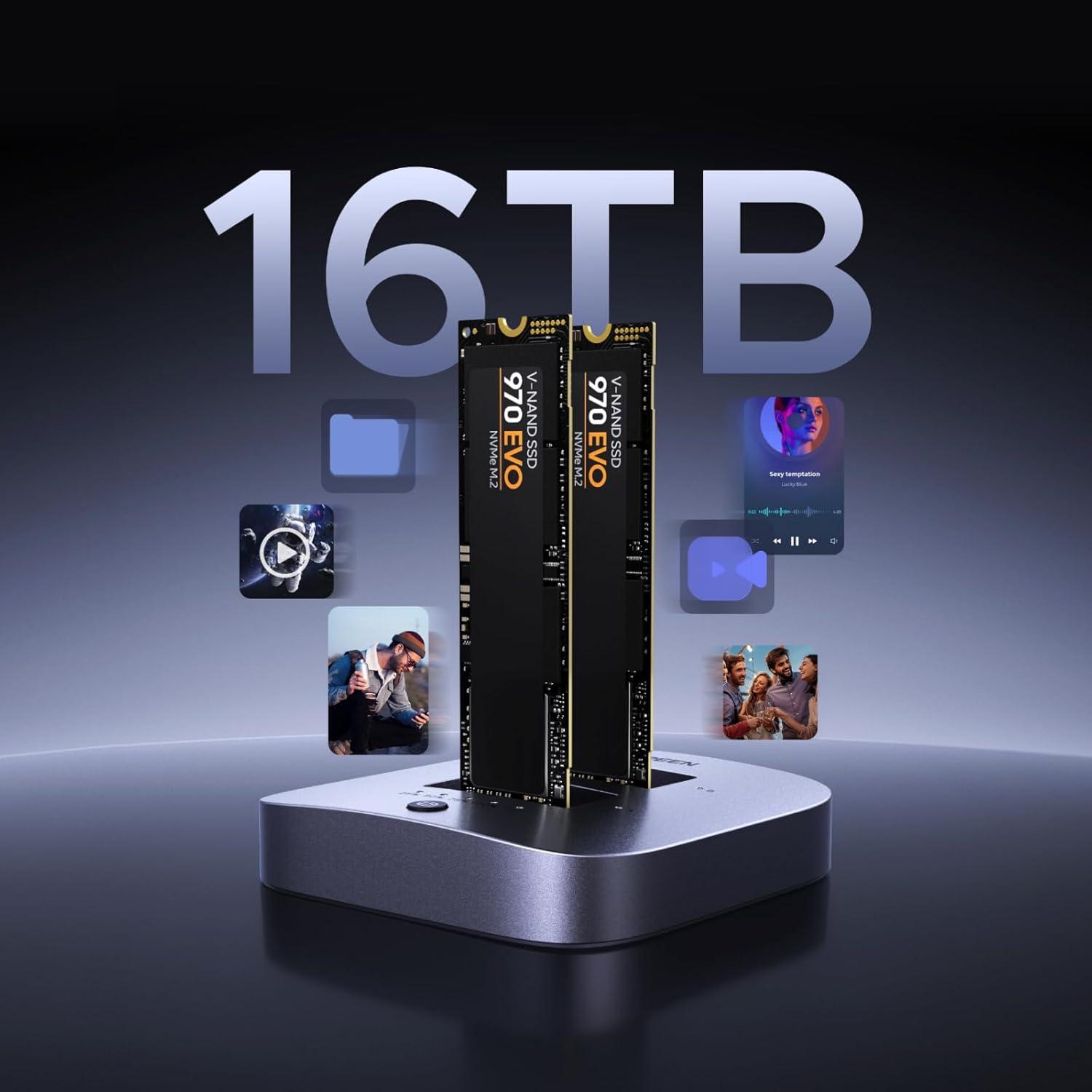 Tool-free dual-bay SSD enclosure: This product requires no tools for installation and can accommodate two NVMe SSDs simultaneously; it's plug-and-play and extremely convenient.The product even supports two 8TB SSDs, so you no longer need to worry about storage capacity.