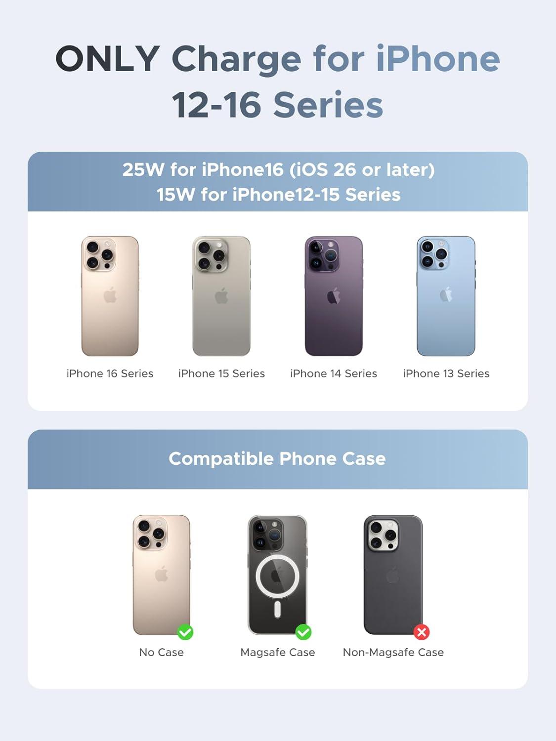 Power Requirement: 25W fast charging supports iPhone 17/16 with iOS 26+. Non-iPhone devices may charge slower due to compatibility. Includes a 3ft USB-C to USB-C cable; if using another cable, ensure it supports 60W or higher