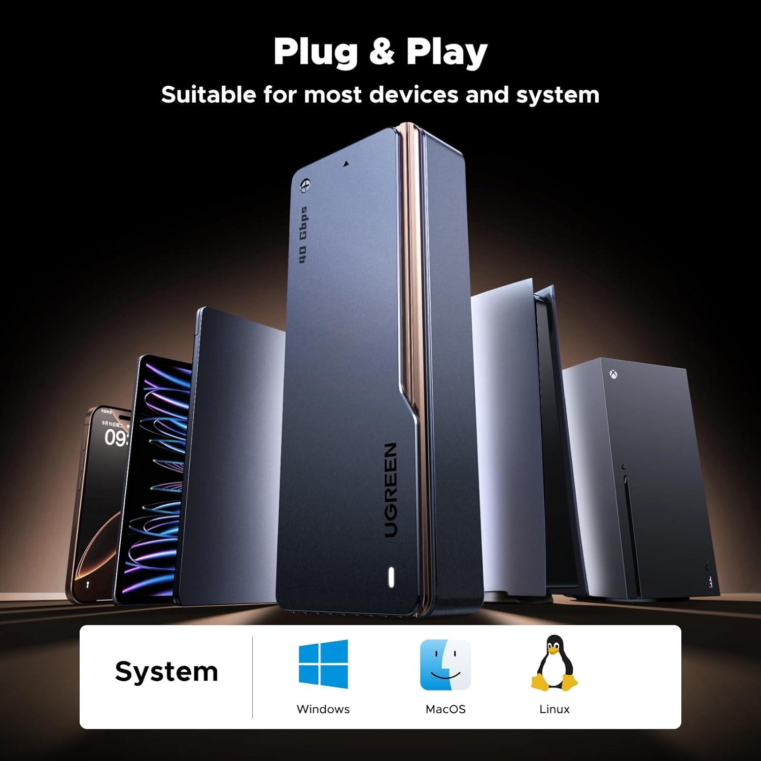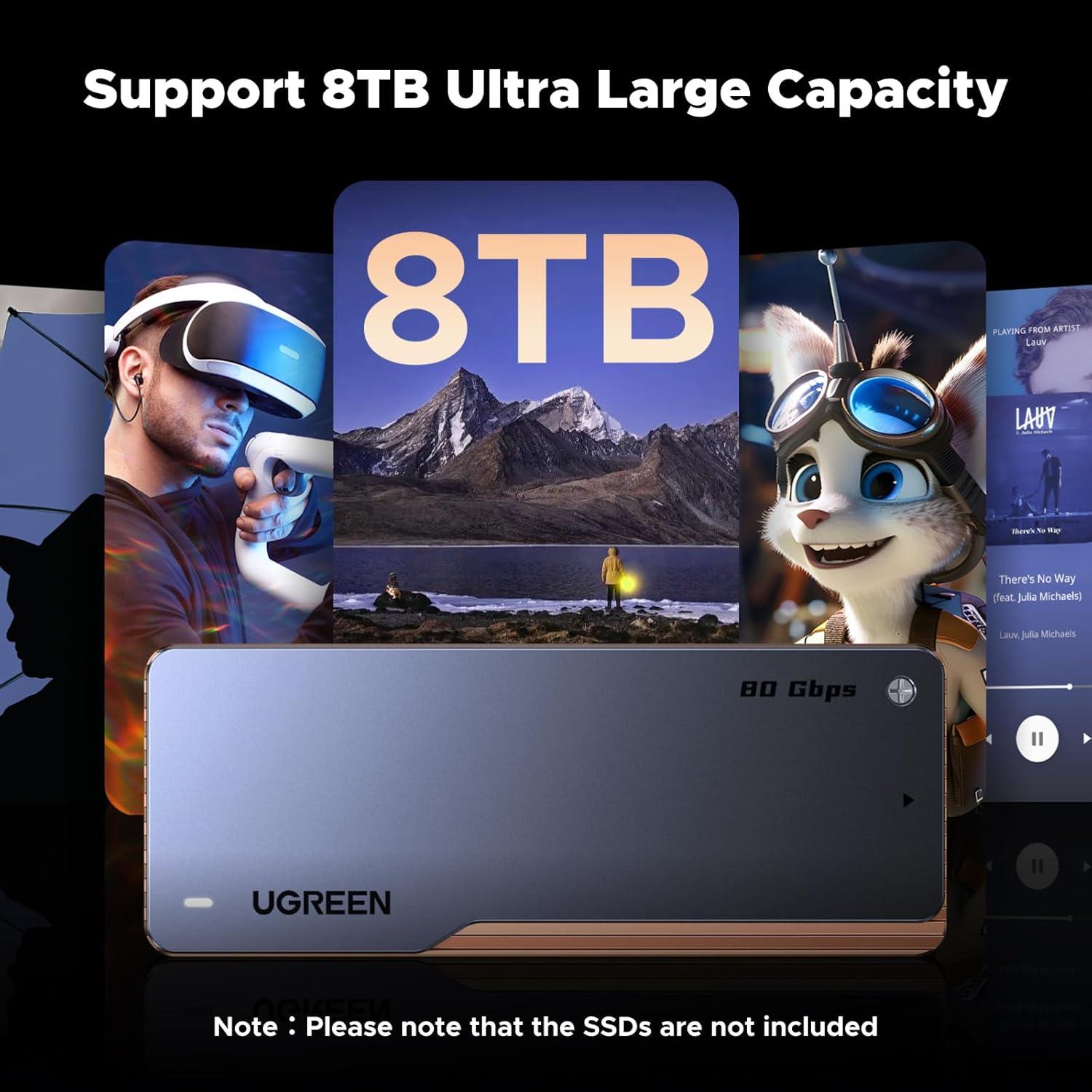 Supports 8TB NVMe(ssd not included):Supports up to 8TB M.2 NVMe SSD, ideal for handling large files, video editing, and backups. Note: Compatible with Windows, macOS, and Linux. Supports 2280-size M.2 NVMe M-Key or M&B Key. Not compatible with SATA-based SSDs 、 pcie 5.0 SSD and 9100 ssd