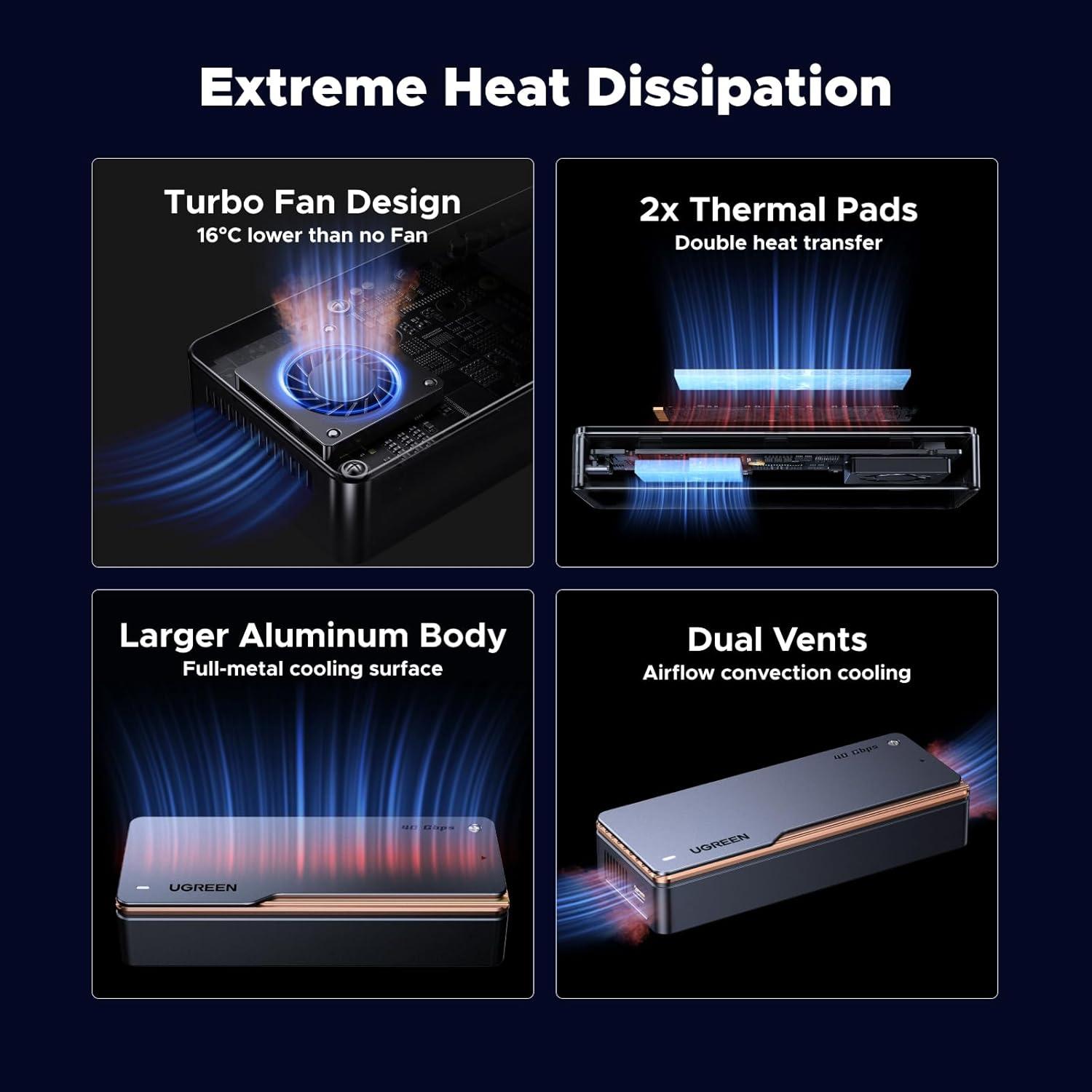 Advanced Heat Dissipation System:Aluminum housing + smart cooling fan ensure efficient heat dissipation. The fan automatically activates when the internal temperature exceeds 40°C, protecting your SSD during heavy use.