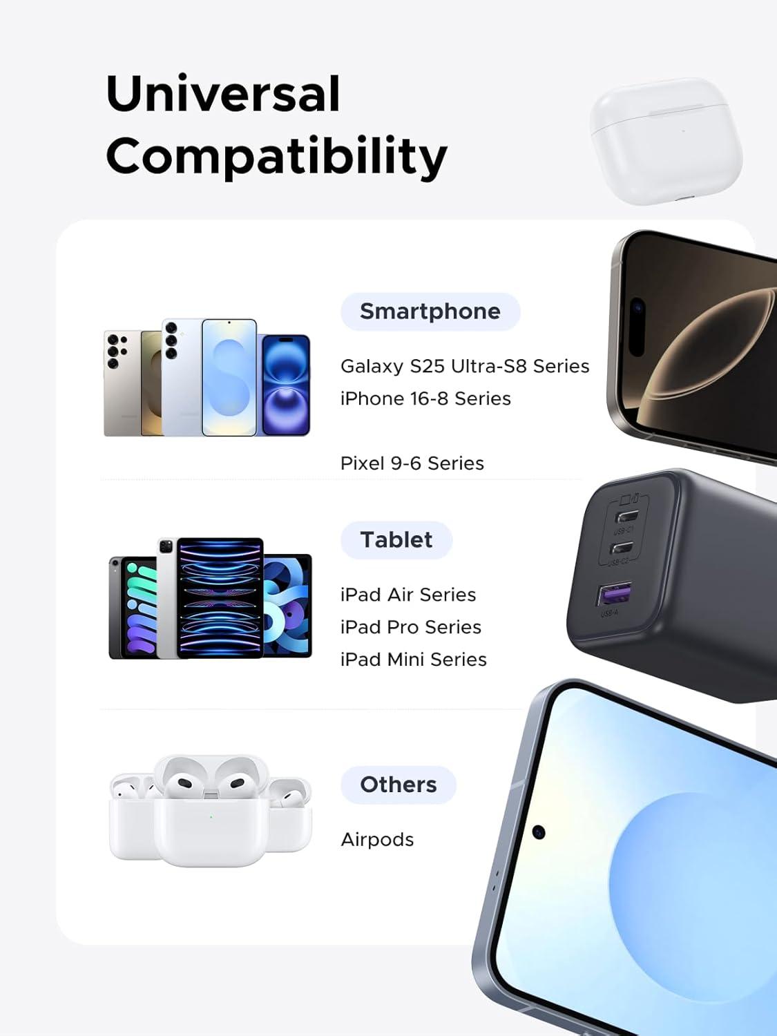 【One charger, all devices】 With support for PD3.0, PPS, QC3.0, FCP, SCP, and AFC protocols, this fast charger USB-C works seamlessly with a variety of devices, including iPhone 12–16, Galaxy S20+, Android phones, iPads, MacBooks, Microsoft Surface, Lenovo ThinkPad, Dell XPS, Apple Watch, AirPods, and more.