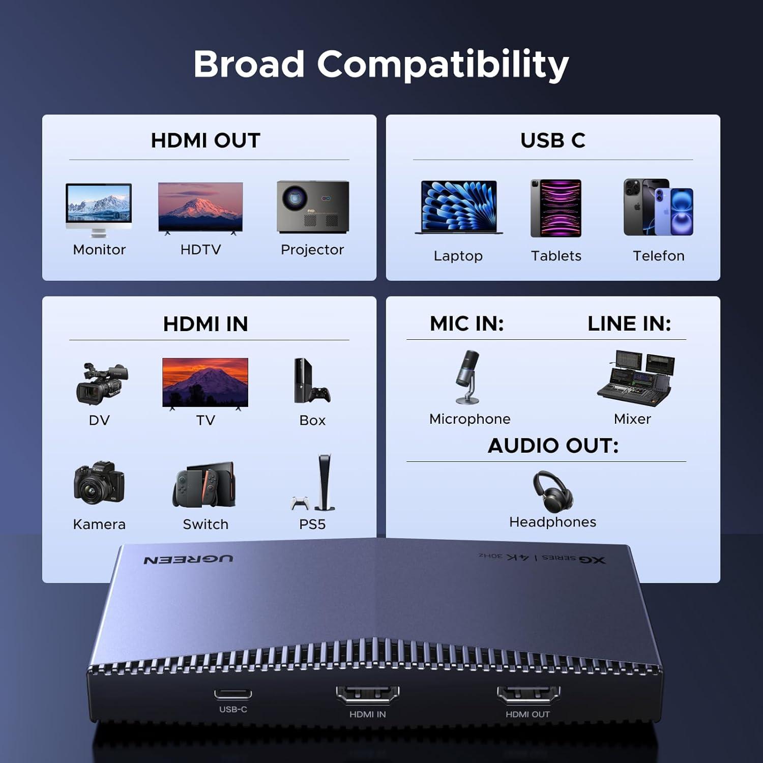 5 Gbps USB 3.2 Gen 1 Low Latency: This capture card for streaming delivers ultra-low-latency streaming from Switch, Switch 2, PS4, and PS5 (with HDCP disabled) to platforms such as YouTube, Facebook, and Twitter via high-speed USB 3.2 data transfer. It supports desktops, laptops, smartphones, and tablets, while maintaining backward compatibility with USB 3.0/2.0 and USB-A and USB-C devices