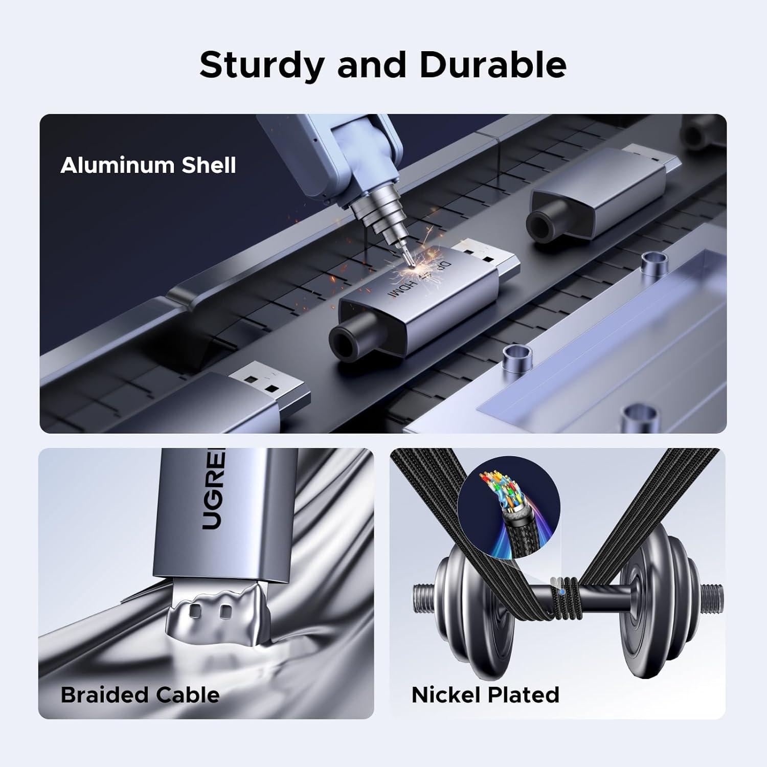 Robust & Anti-Interference: Robust EMI-shielded cable with 30AWG copper (video)/tin-plated copper (USB power), dual Al-foil + Al-Mg braid, nickel-plated corrosion-resistant connectors, aluminum heatsink shell, and high-tensile textile sleeve exceeds PVC