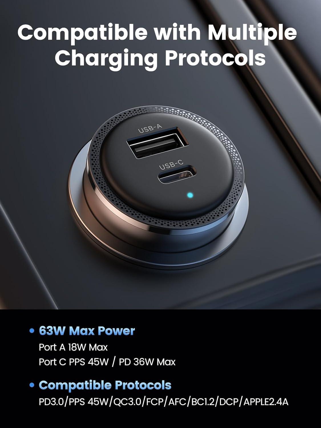 63W Simultaneous High-Speed Charging: Equipped with 45W PD3.0 PPS USB-C port and 18W USB-A port, this Car Charger can fast charge 2 devices simultaneously with a total output of 63W