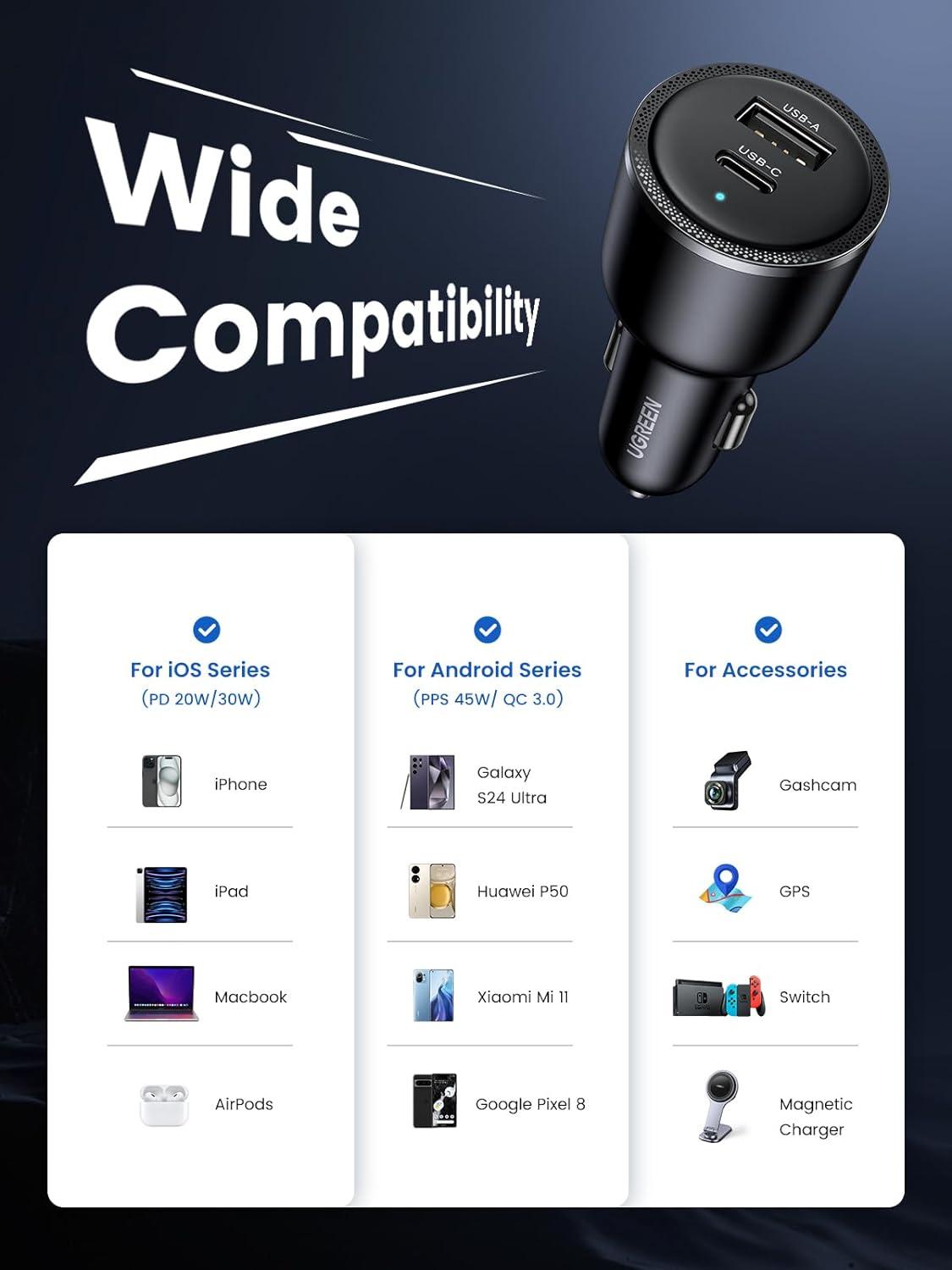 Wide Compatibility: USB car charger works flawlessly with any USB-C and USB-A powered devices, including the Galaxy series, iPhone 17/16/15/14/13 series, Google Pixel series, Moto series, Xiaomi series, and more; iPads, Samsung Tab, and more