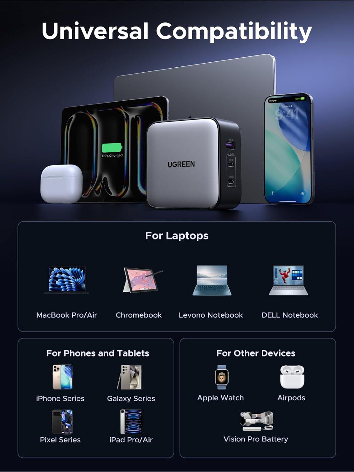 Wide Compatibility: The 65W international charger is compatible with almost all devices. For MacBook Air, XPS laptops, Surface Pro 10/9/8/7/6, iPad Pro/Air, iPhone 8-17 Series, Galaxy S10-S25 Series, Steam Deck, Switch, AirPods, Watch 11/10/9/8/7, etc