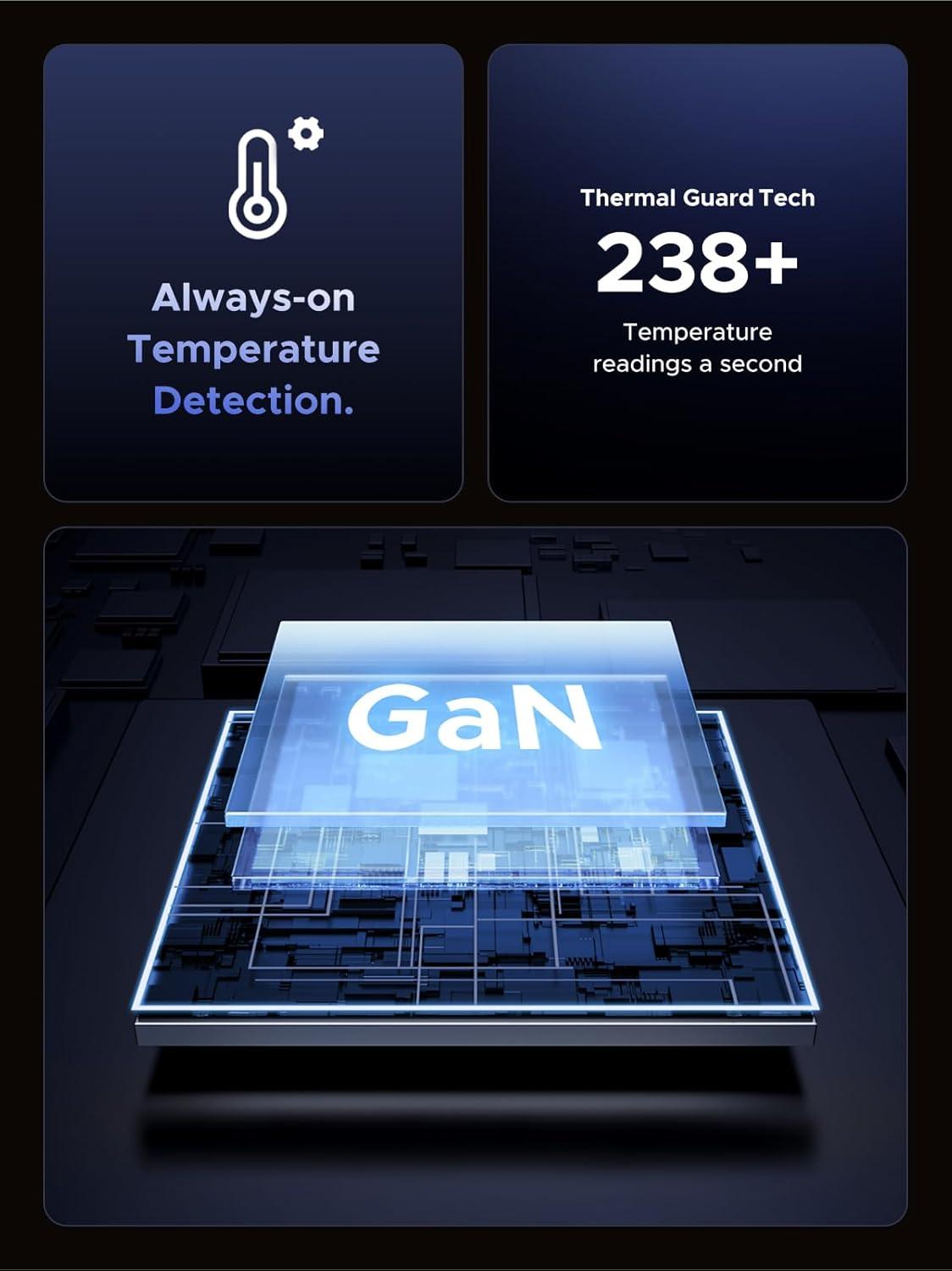 Powerful GaN Chip: With GaN chip, the charger is smaller, charging faster and more energy efficient. This makes it easy for you to take the compact GaN charger with you during your holiday abroad without taking up too much usable space in the case