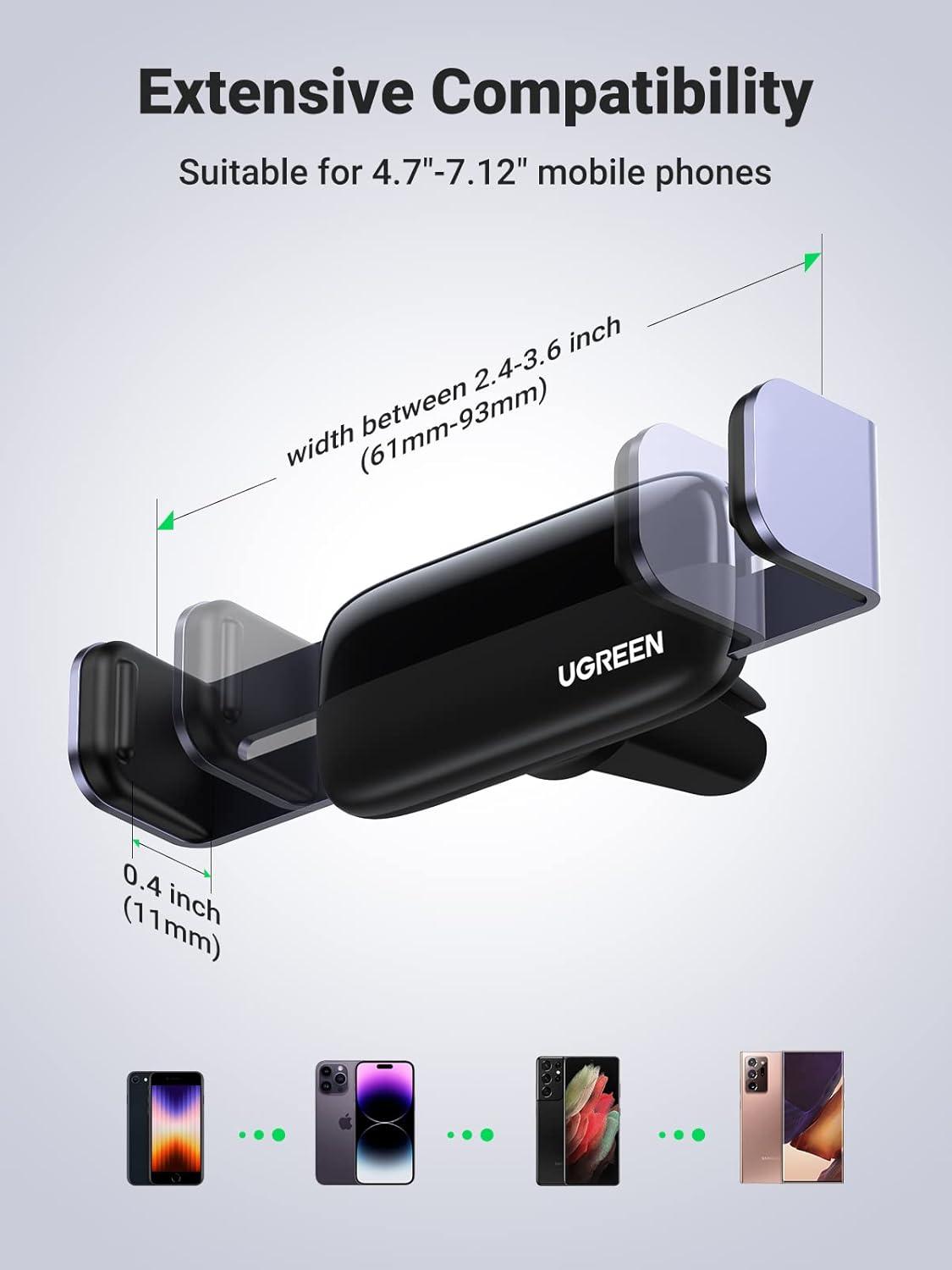 Hold Your Phone Securely: UGREEN phone mount for car adopts spring-loaded grip structure which fixes securely and snugly without wobble. Even on bumpy roads, this retractable car phone mount clamps the phone securely, effectively preventing it from falling off