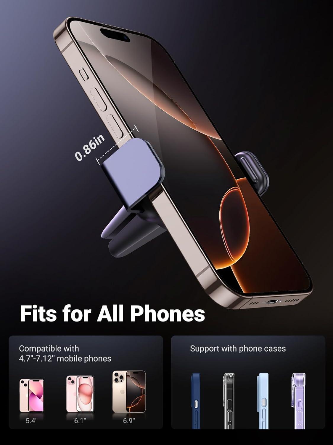 Broad Compatibility: The vent phone mount for car fits 4.7 to 7.12 inch mobile phones, with width range from 2.4″ to 3.6″. Please ensure the Max thickness of phone with case is under 0.43″. Compatible with new iPhone 17 16 15 Pro Max, iPhone 14 Pro 14 Plus 14 13 12 Mini, iPhone 11 Pro XS Max XS XR 8 7 Plus 6S SE, Samsung Galaxy S22 S21 S10 S9 S8 S7, etc