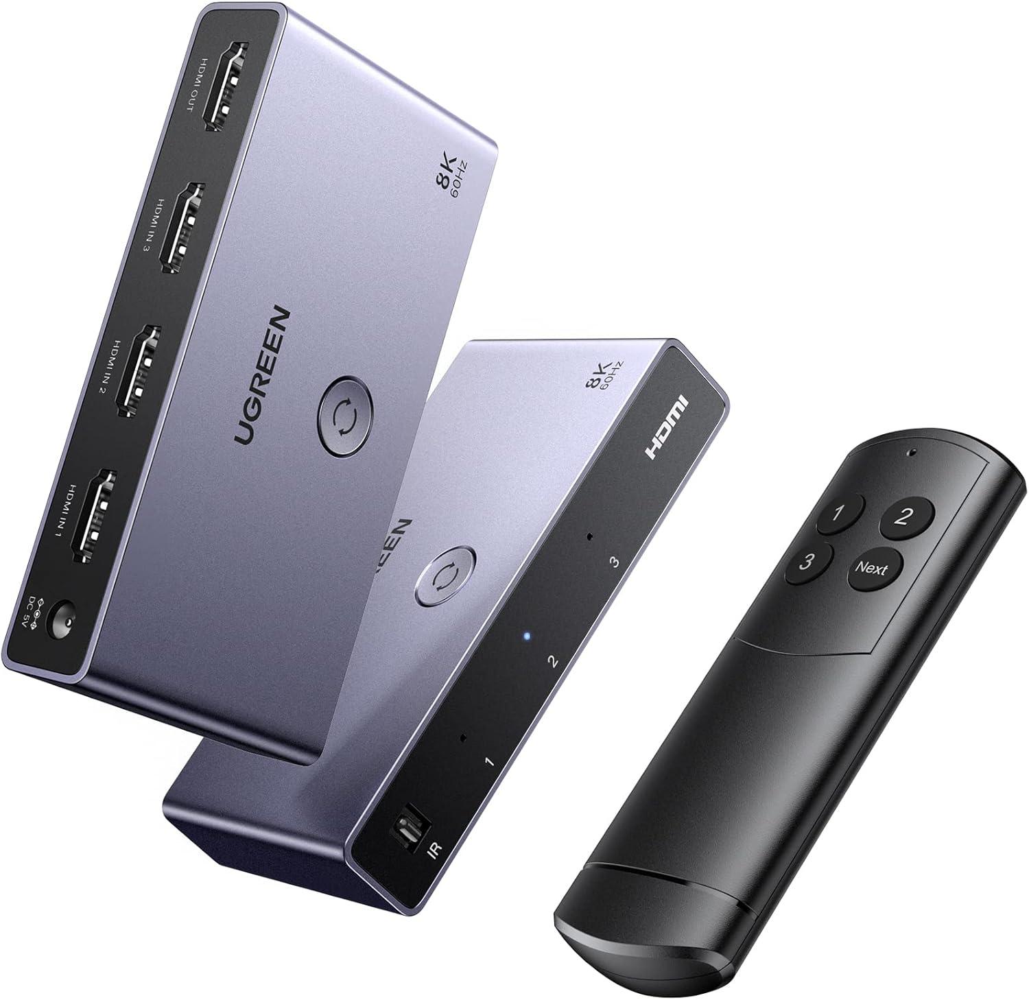 UGREEN HDMI 2.1 Switch Aluminum Ultra HD 8K@60Hz 3 in 1 Out HDMI Splitter with Remote Switcher Box Support 3D CEC HDR HDCP2.3 Compatible with PS4/3 Xbox Nintendo Switch Roku TV Fire Stick