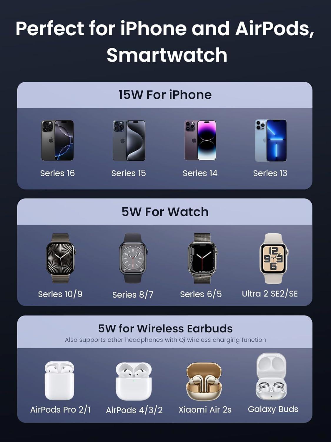 What's in Package: Includes UGREEN MagFlow Wireless Charging Station (Foldable 3-in-1), 30W USB-C charger, and 3.3 ft USB-C charging cable for daily movie watching and video calls. Note: For optimal charging, please use the included 30W adapter