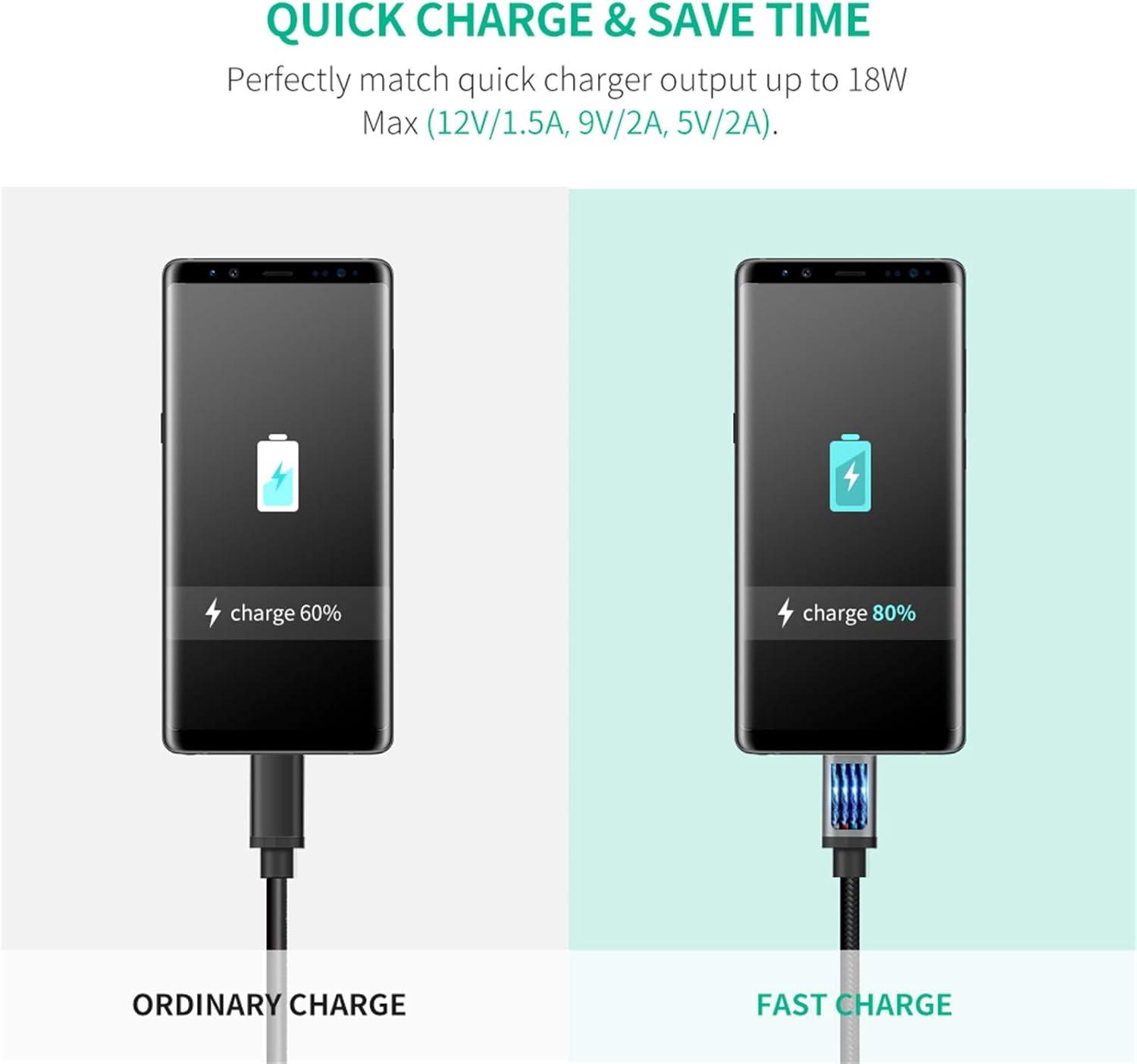 Fast Charging & Data Sync: Ultra-thick copper USB A male to Micro USB cable with low resistance output up to 18W, 69% faster than standard cable(5V 2.4A), fully charging Galaxy S7 in 100min, Data transfer 480Mbps, Two-in-one charging, and data transfer; Note: Fast charging requires QC 2.0/3.0 device and adapter.