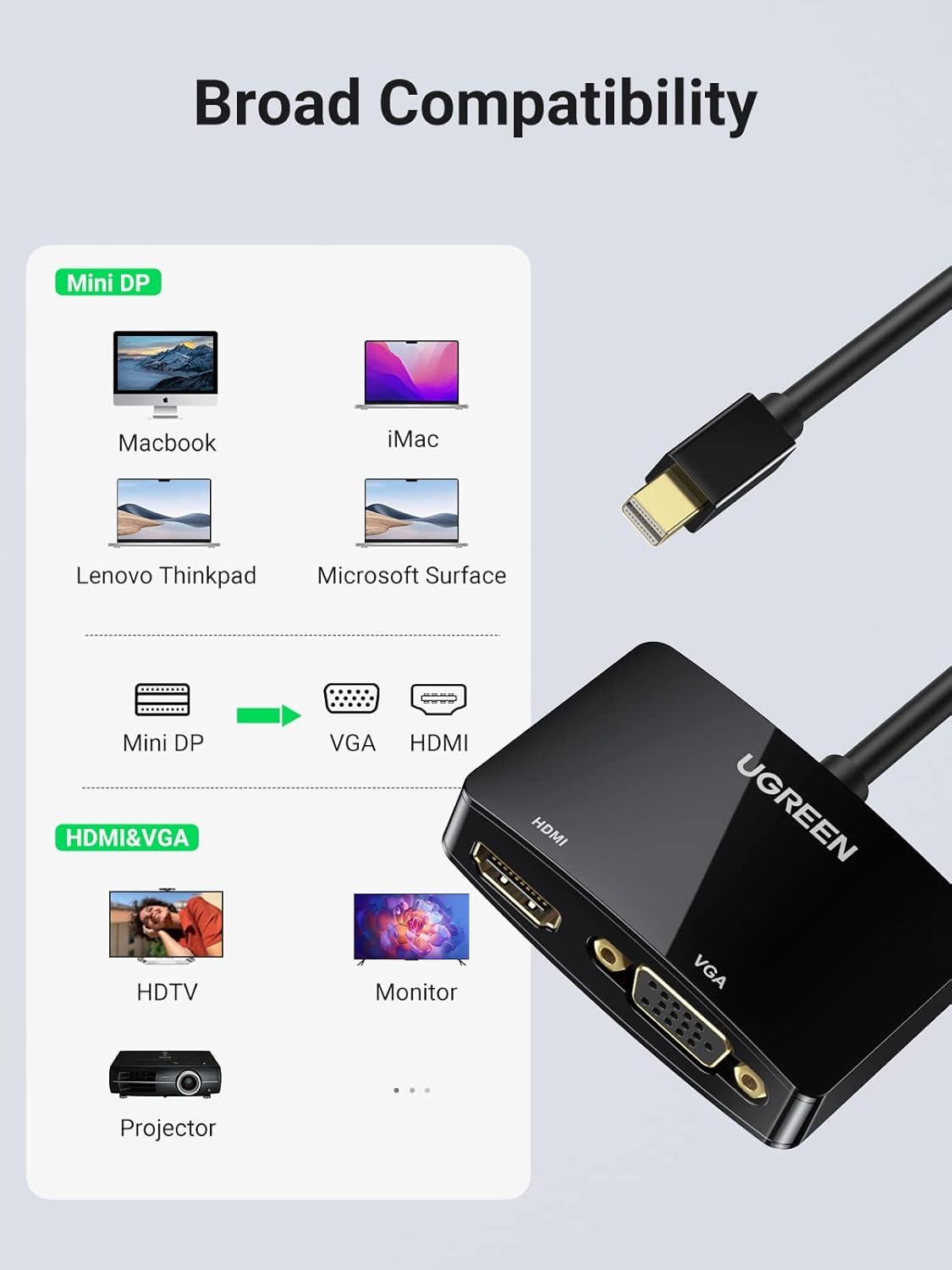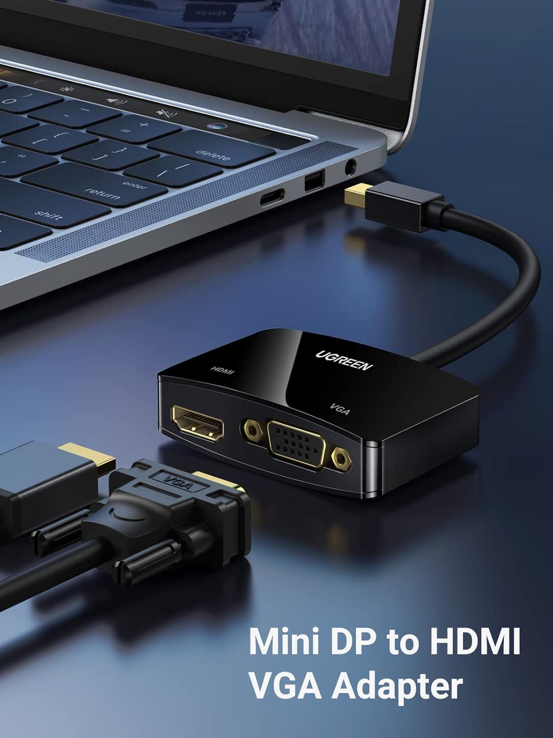 Mini DP to HDMI and VGA Adapter: This UGREEN mini DisplayPort is used to connect the equipment with the Mini DisplayPort to an HDTV, display, monitor, and projector equipped with an HDMI port or VGA port. With the help of this thunderbolt 2 adapter, you can enjoy high-definition video and images on your large-screen display. Note: HDMI and VGA ports can't be used simultaneously