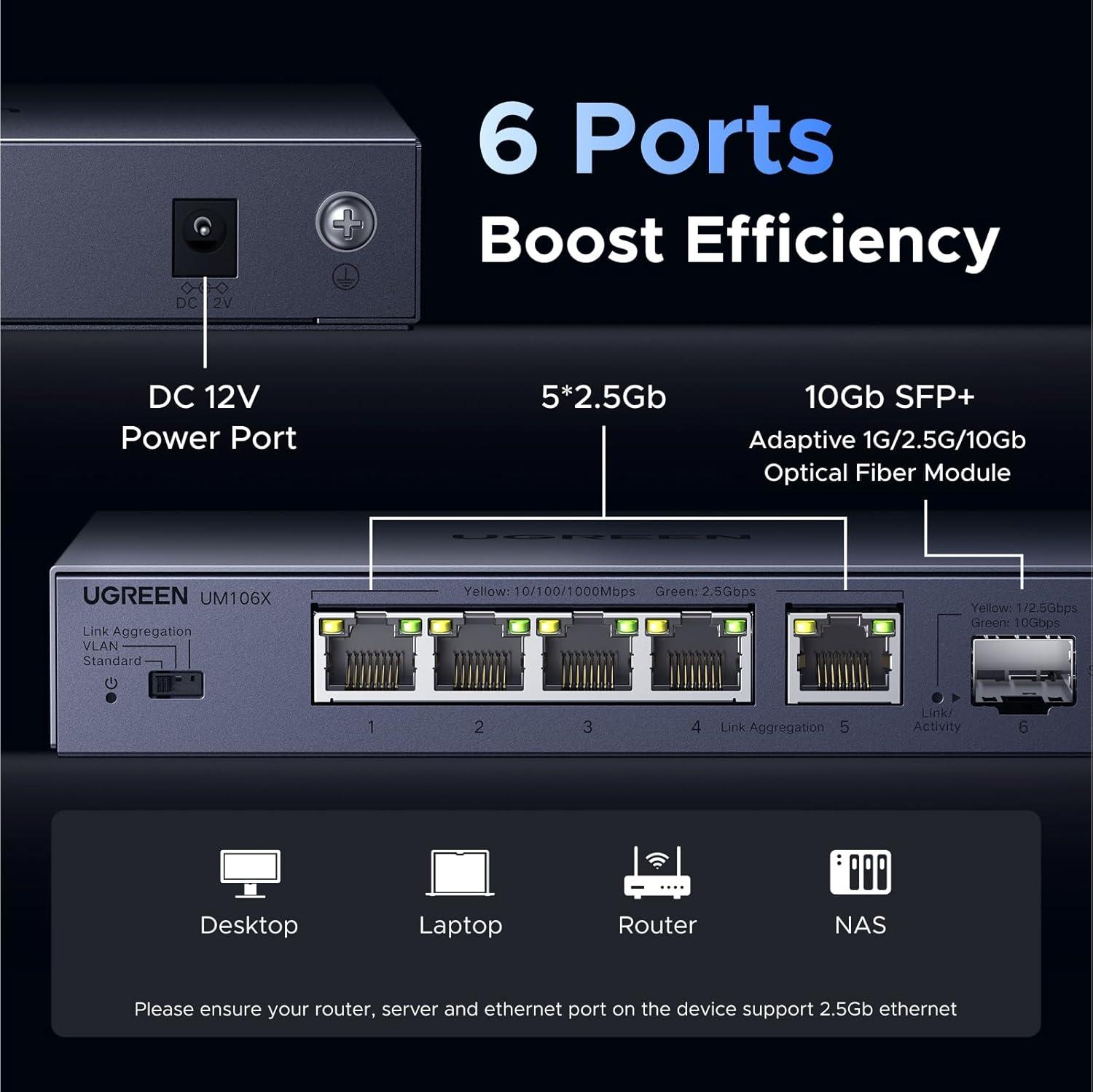 Unlock 2.5Gb & 10Gb for Ultimate Speed: UGREEN 6-Port 2.5Gb Switch features 5 x 2.5Gb uplink ports and 1 x 10Gb SFP+ port, unleashing the full potential of your network-enabled devices. Perfect for pairing with NAS for high-speed data transfers, enabling immersive low-latency gaming, or boosting productivity in small teams and business environments, this switch brings next-level performance