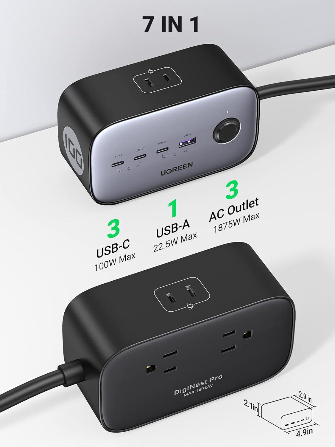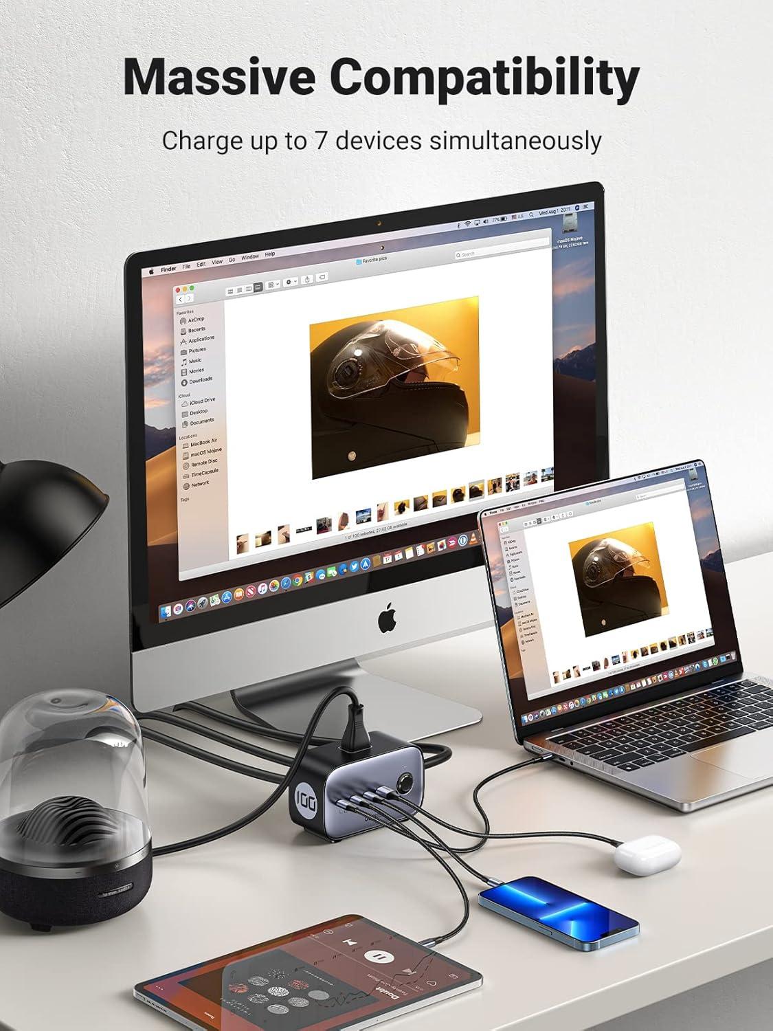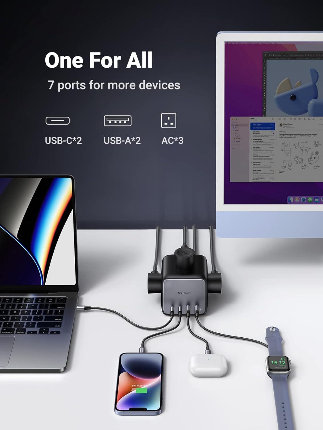 7-in-1 Charging Station: With 3 USB-C ports, 1 USB-A port and 3 AC outlets (1875W/15A), Ugreen 100W Charging Station can charge up to 7 devices at the same time and provide a clutter-free desktop.