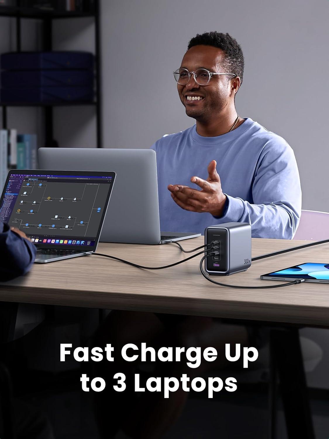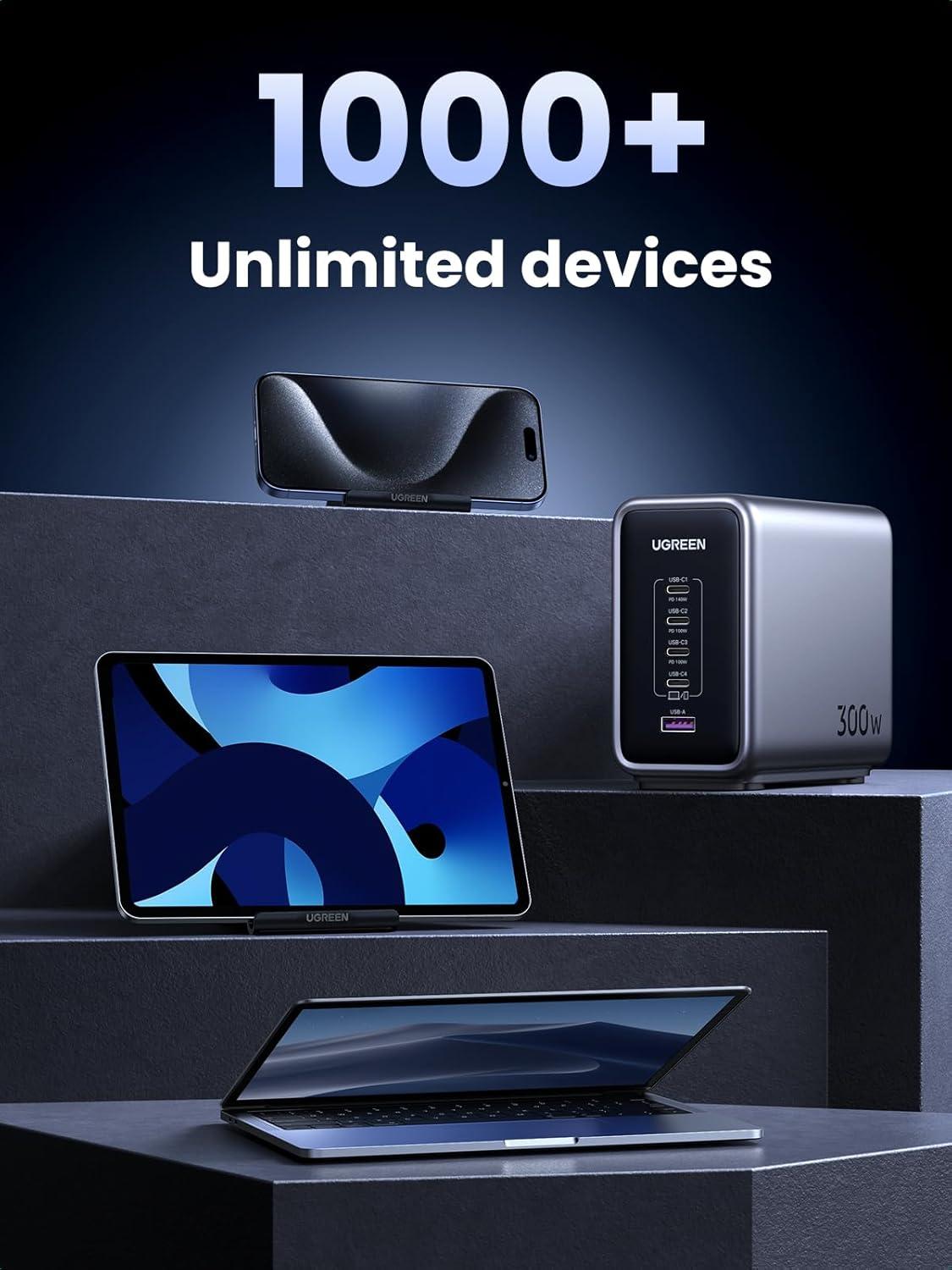 Universal Compatibility: Built to charge 5 devices at the same time, this 300W desktop charger is compatible with MacBook Pro/Air, Dell XPS, iPhone 17/16/15 Series, Galaxy S25/S24/S23/S22/S21/S20, iPad Air/Pro, Pixel 10/9, Steam Deck, etc