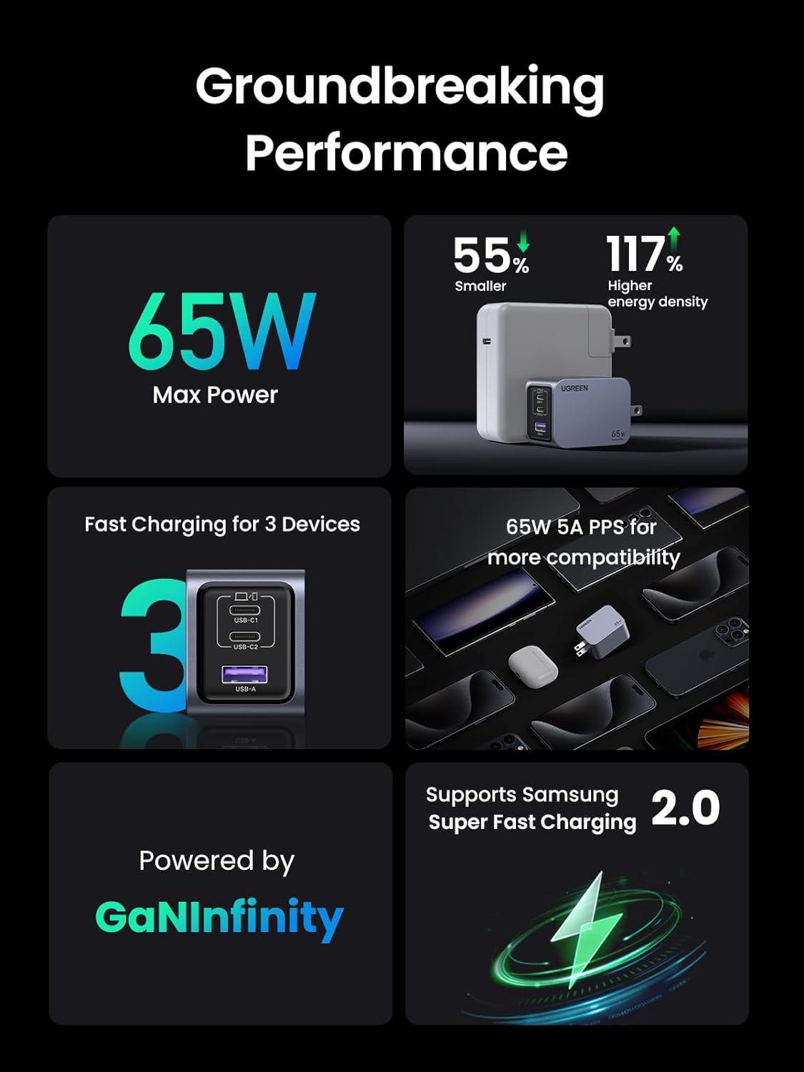 GaNInfinity Chip: A new generation of GaN technology brings you a faster and more powerful charging experience. Fantastic efficiency with less heat generation in a small, lightweight design
