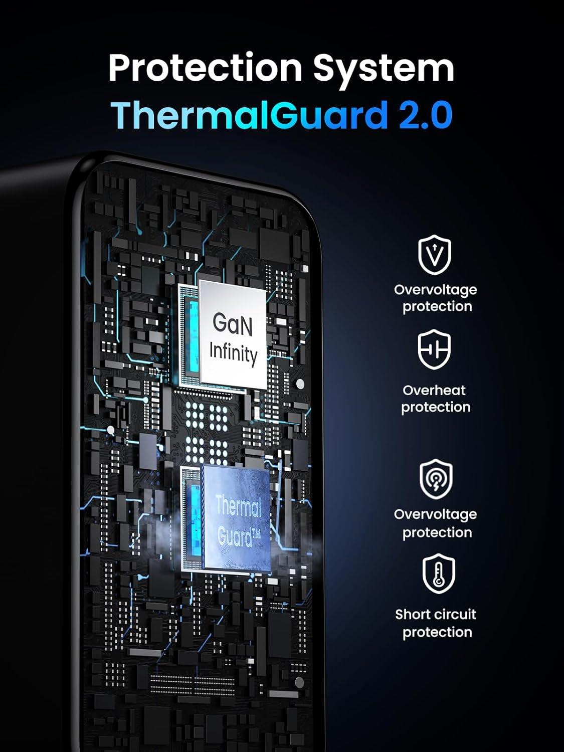 Comprehensive protection: The 100W charger uses GaN technology, which has low heat generation and low energy loss, ensuring efficient use of energy. Equipped with overvoltage, overcurrent, overheating, and short circuit protection to protect your device