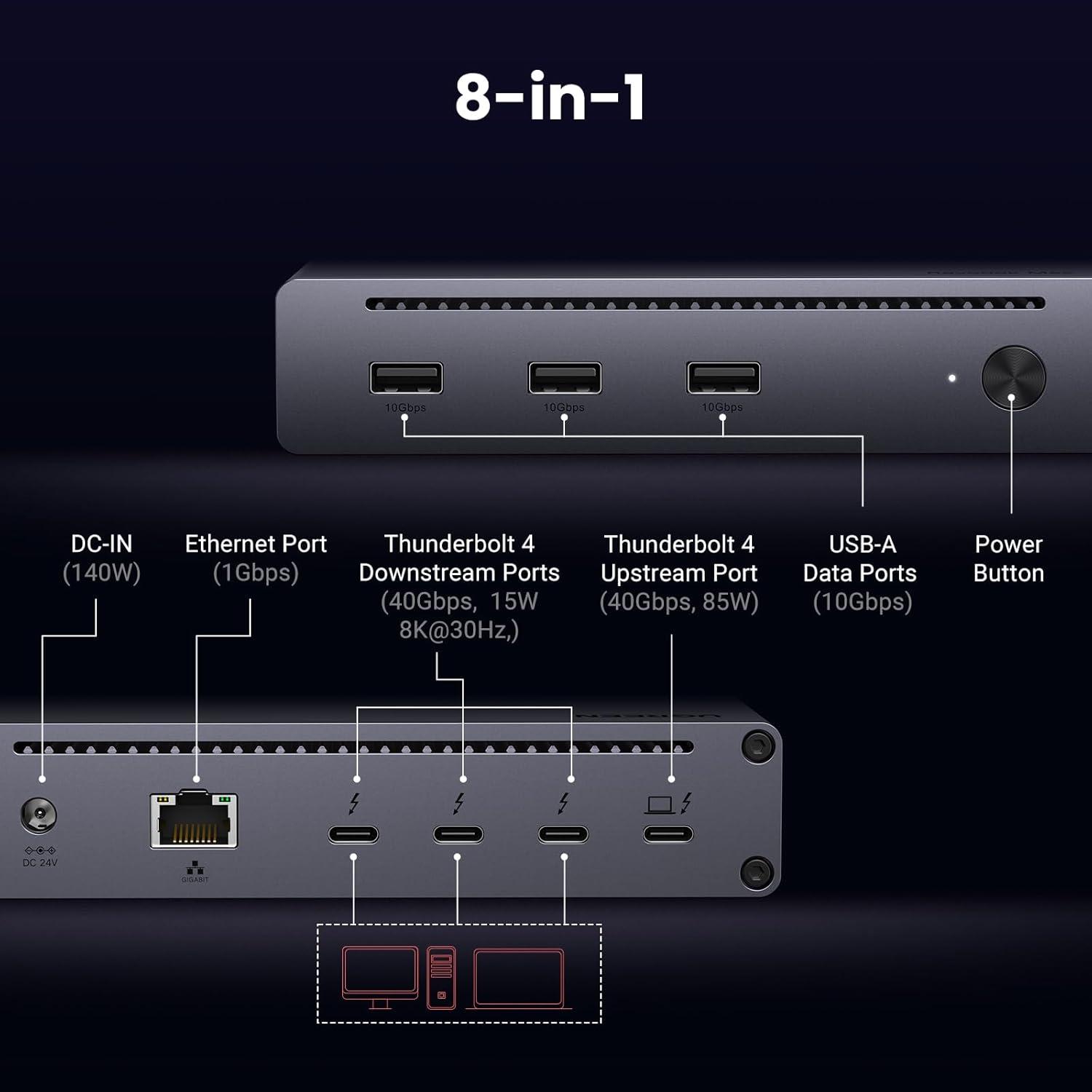 8-in-1 Massive Expansion: The 8-in-1 Thunderbolt 4 Dock is equipped with 3x Thunderbolt 4(40Gbps, 15W), 3x USB A 3.2(10Gbps), a gigabit ethernet, and a 140W DC power ports, which can meet all your high-performance expansion needs.