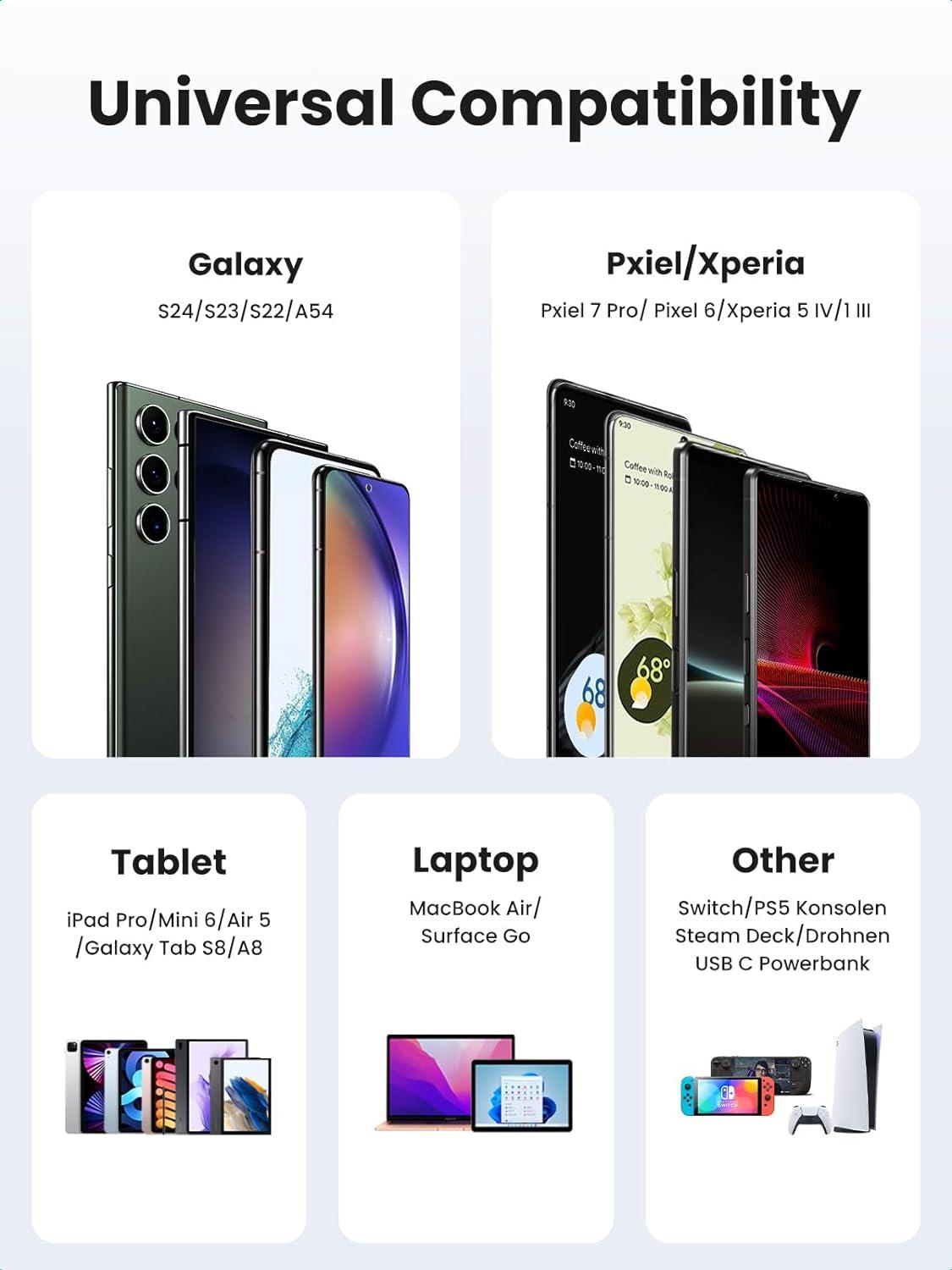 Wide Compatibility: UGREEN 60W Type C fast charging cable is compatible with USB-C port devices, such as mobile phones (iPhone 15/15 Plus/15 Pro/15 Pro Max, Samsung S24/23/22/S21, Google Pixel 8/7, LG), tablets (iPad Air 5/4, iPad Mini 6, Galaxy Tab A9+), laptops (MacBook Air/Pro), switches and more USB-C devices
