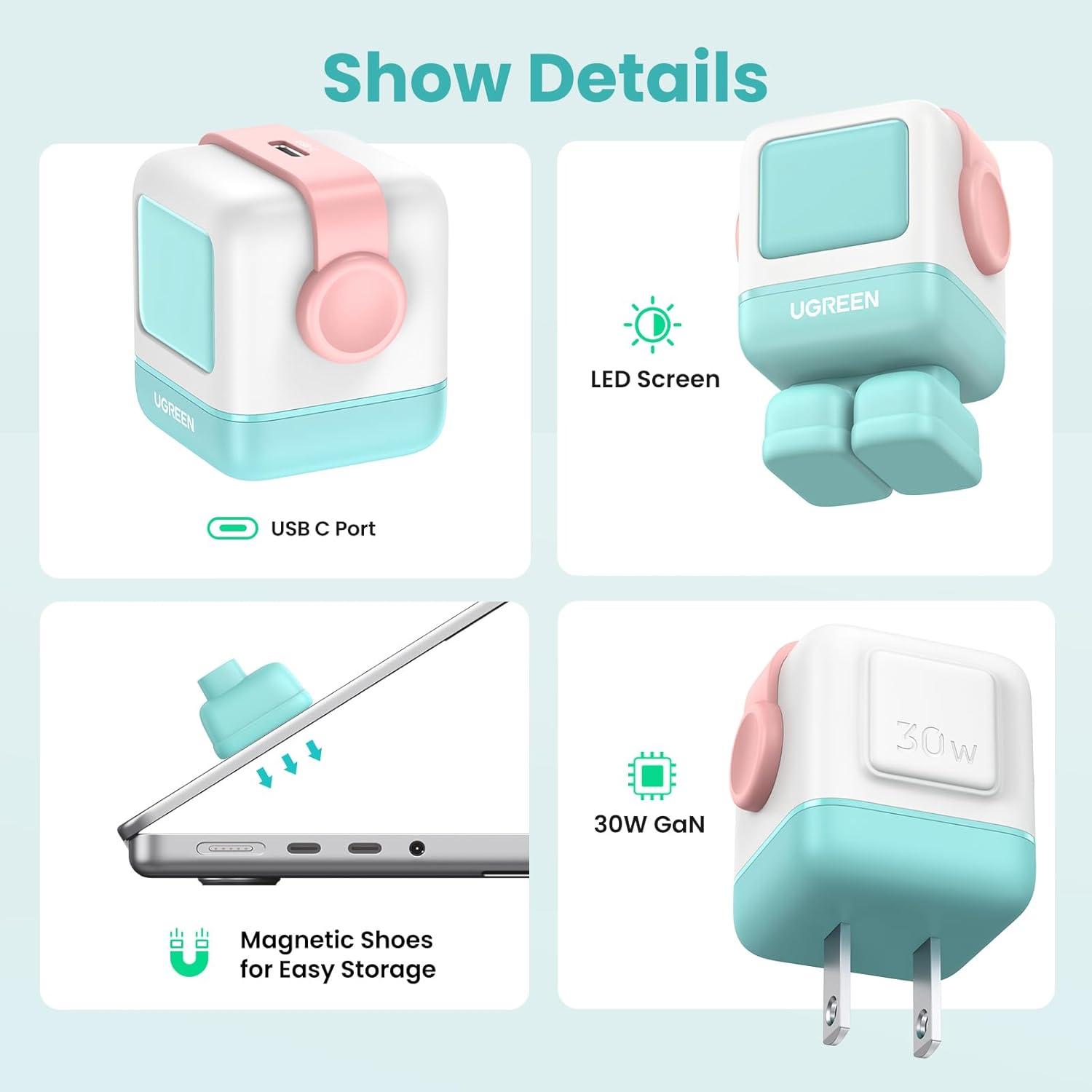 imageUGREEN Uno 30W USB C Charger Block Compact Nexode Robot GaN Fast Charger for iPhone 17161514 Galaxy S25S24S23S22 Pixel 109876 MacBook Air iPad Pro BlackPink Blue