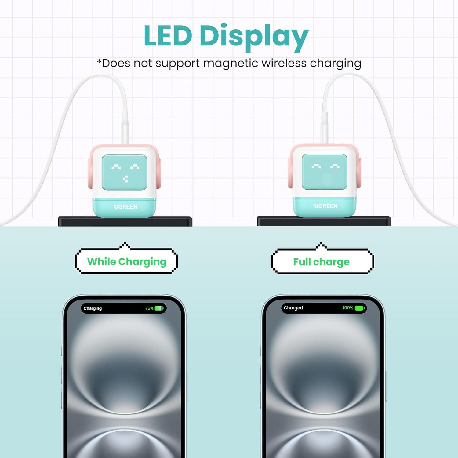 UGREEN Uno charger: UGREEN creative series charger, robot shape, LED screen, showing different interesting expressions according to different charging status. Its feet are magnetic and can be stuck on the refrigerator or computer without getting lost( Note: The expression will only appear when the power is on.)