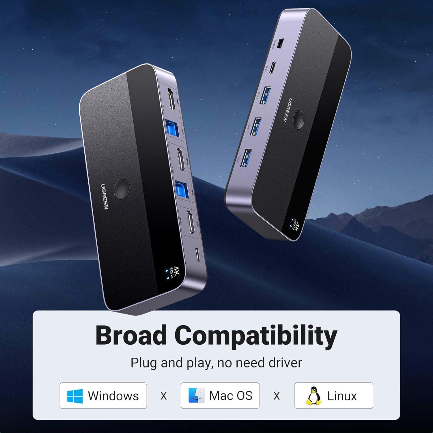 Sharing 4 USB 3.0 Ports: UGREEN KVM switches has 3 USB-A ports and 1 USB-C port for sharing USB flash drives, printers, mobile hard drives, U disk, and other USB 2.0 and USB 3.0 devices. USB 3.0 offers data transfer speeds of up to 5Gbps, while USB 2.0 is only 480Mbps. It allows faster file and picture transfer to make work and life more convenient