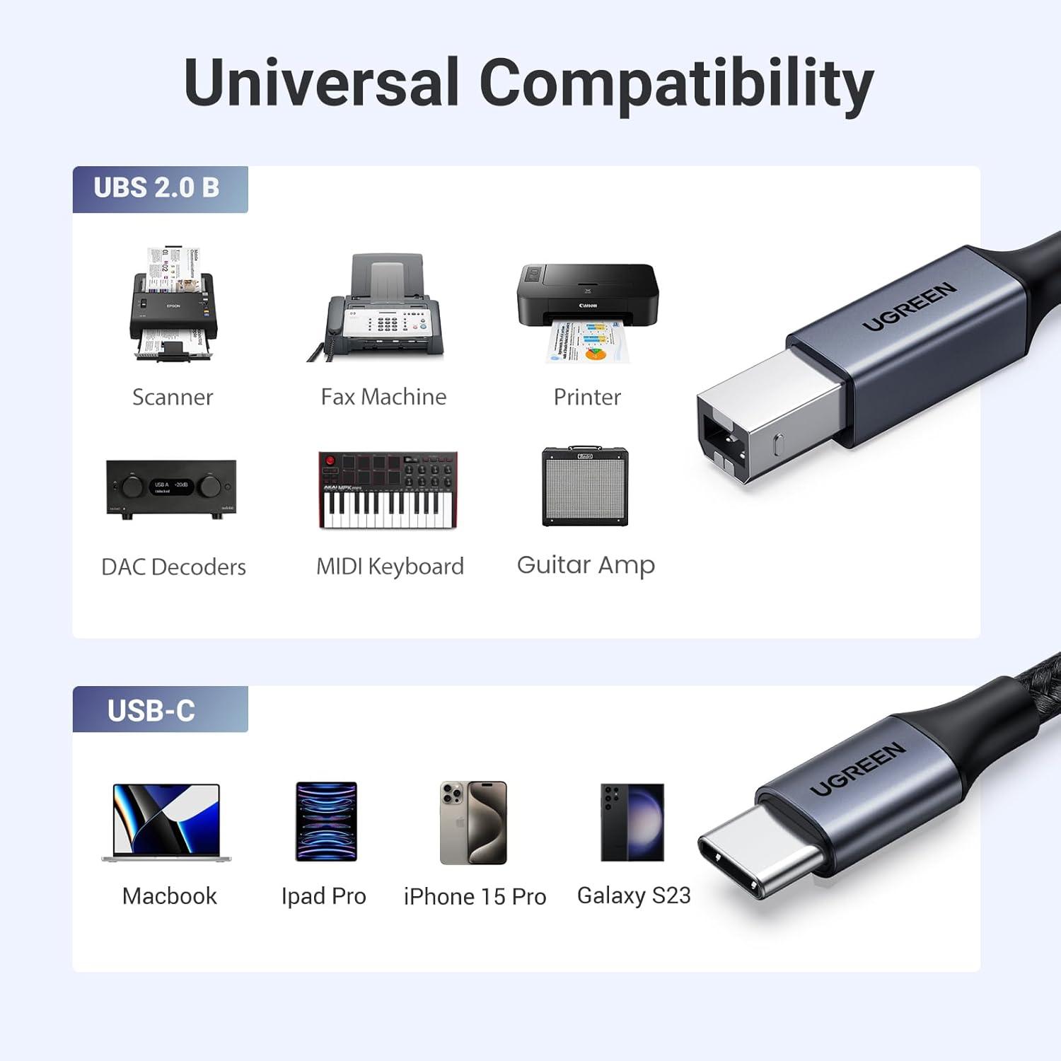 UGREEN USB B to USB C Printer Cable 3 FT, Nylon USB B to USBC Cable for MacBook Pro/Air, MIDI Cable Compatible with MIDI Keyboard/DJ Controller/DAC/Yamaha Casio Digital Piano for iPad(Black)
