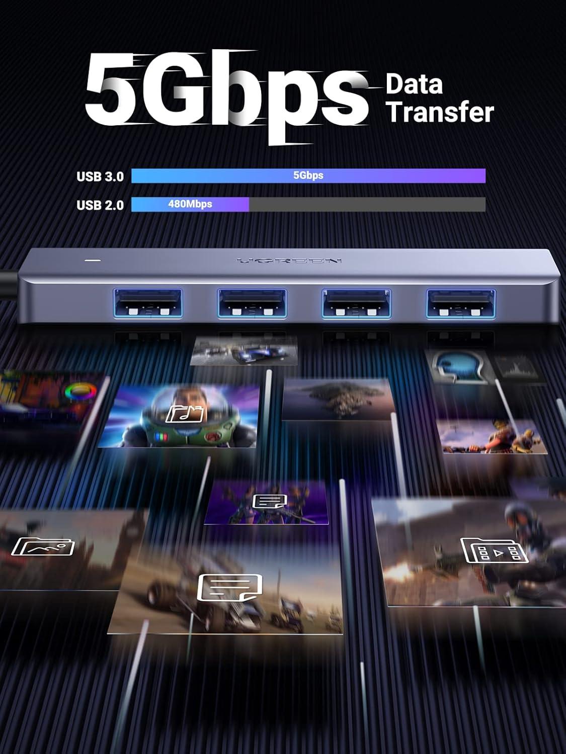 5Gbps High Speed: With the 4 ports USB C hub, you can transfer HD movies or large files in just seconds with super fast data transfers of speed up to 5Gbps, 10X faster than USB 2.0 (480 Mbps)