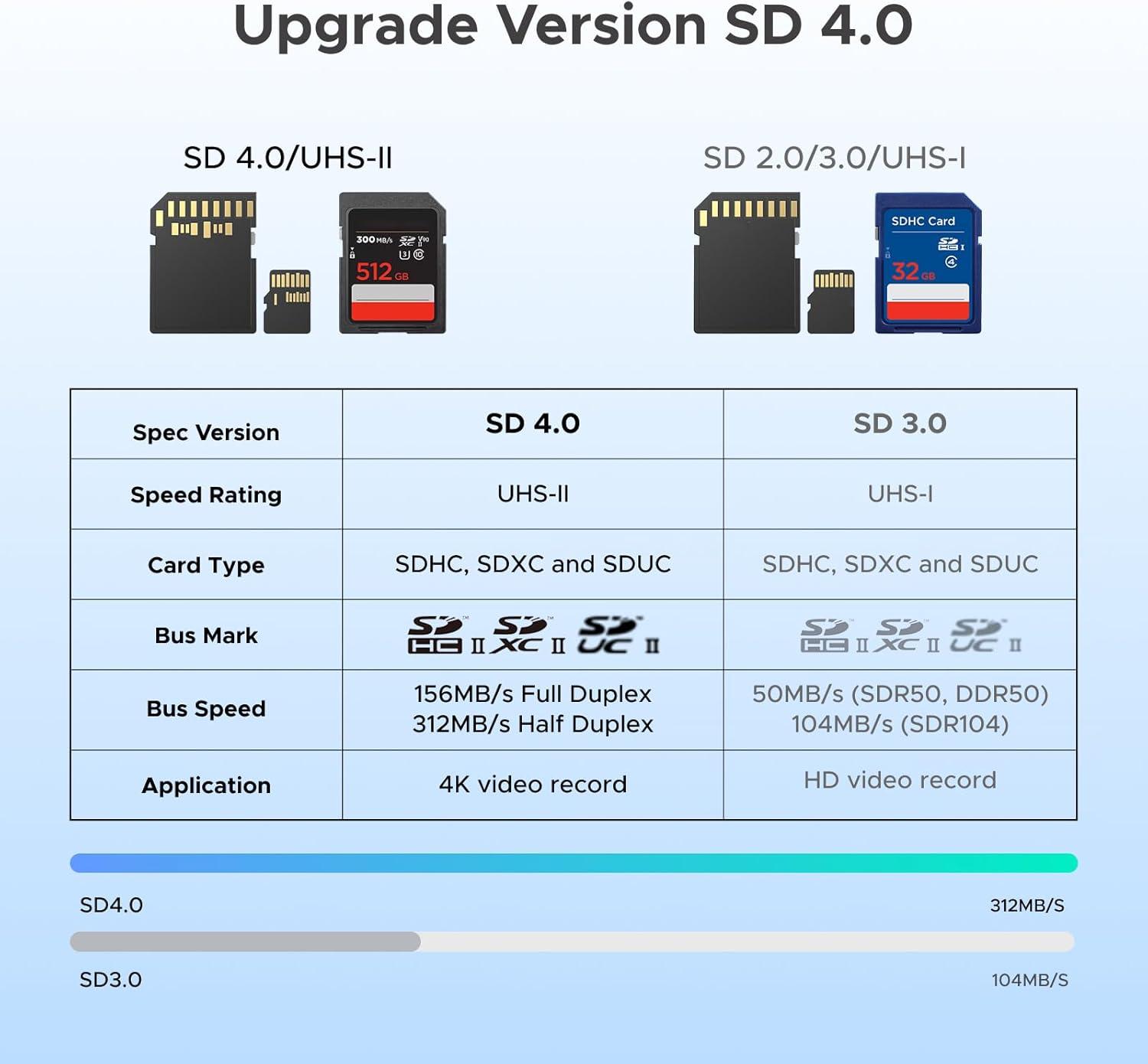 2-in-1 design: The USB C SD Card Reader can be easily connected to PC and mobile phone via USB A or USB C interface. The two slots support SDXC, SDHC, MicroSD, MMC, RS-MMC, Micro SDXC, Micro SDHC, UHS-II, and UHS-I cards up to 2TB