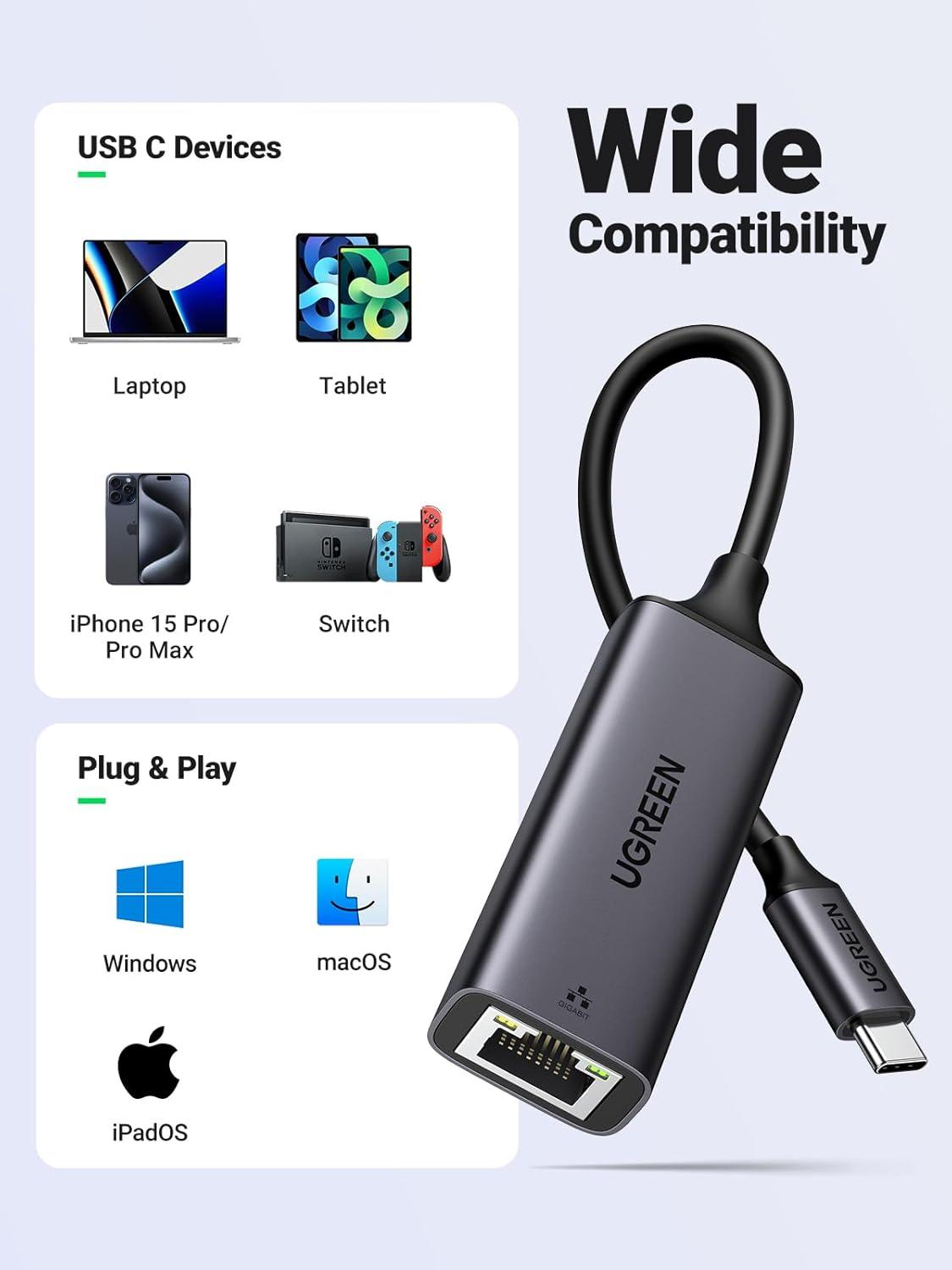 USB-C Meets 1000Mbps Ethernet in Seconds:UGREEN usb c to ethernet adapter supports fast speeds up to 1000Mbps and is backward compatible with 100/10Mbps network. Perfect for work, gaming, streaming, or downloading with a stable, reliable wired connection