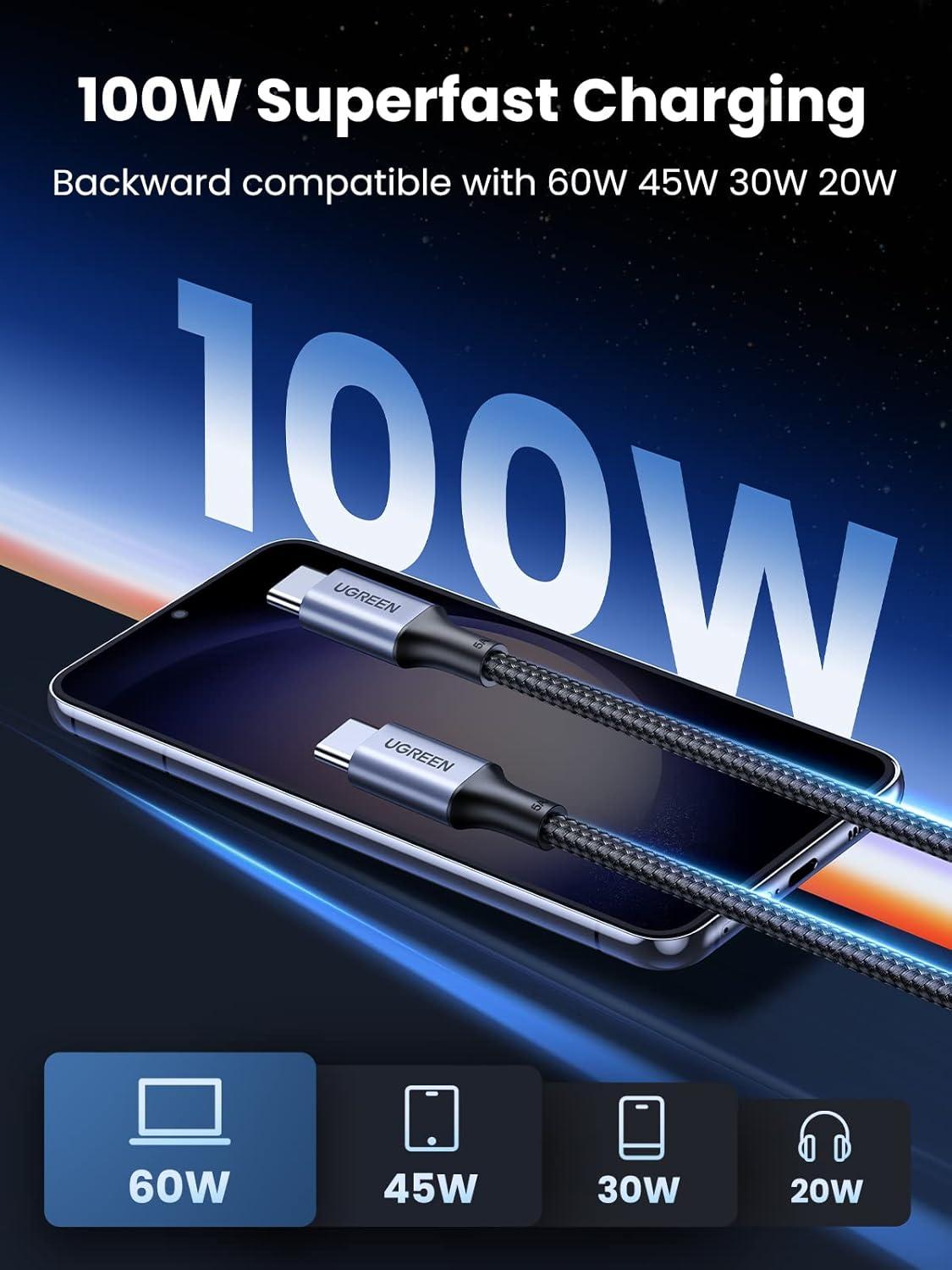 100W Fast Charging: The UGREEN USB C cable supports 100W fast charging with PD3.0 and QC3.0 technology to quickly charge iPhone 15 to 60% in just 30 minutes. Backwards compatible with 65W/45W/30W/20W chargers