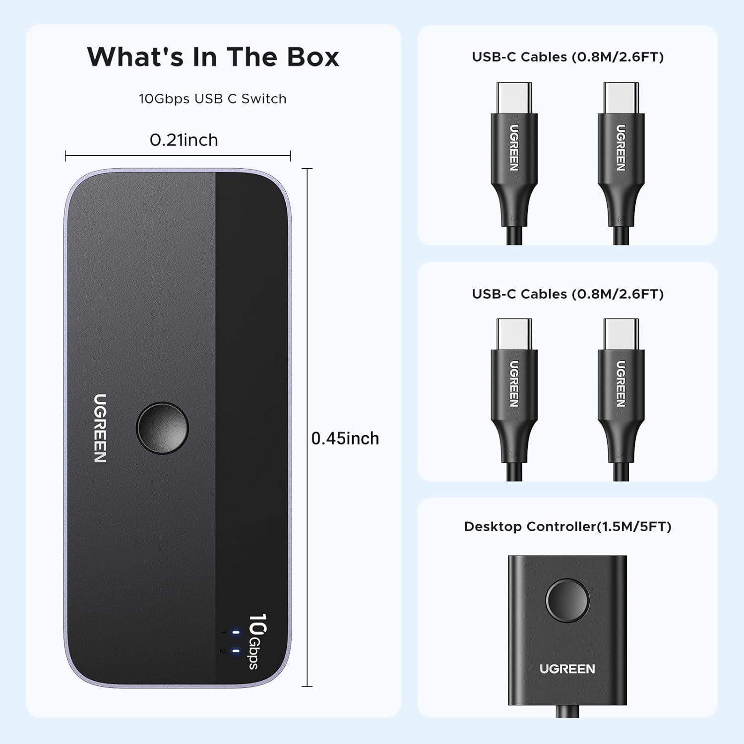 UGREEN USBC Switch 2 Computers Share 4 USB 3.2 Ports, 10Gbps Switcher Selector for PC Laptop Keyboard Mouse, Sharing Switch Adapter with 2 USB-C to C Data Cables and Remote