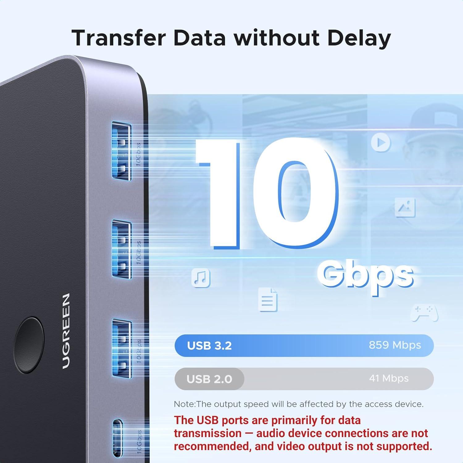 10Gbps Transfer Speed: The USB-C switch is equipped with 4 USB 3.2 Gen 2 ports and speeds up to 10Gbps. Faster than traditional 5gbps USB Switches, Transfer 1 GB files in 1.5 second to improve work efficiency without waiting.(The USB ports are primarily for data transmission — audio device connections are not recommended)