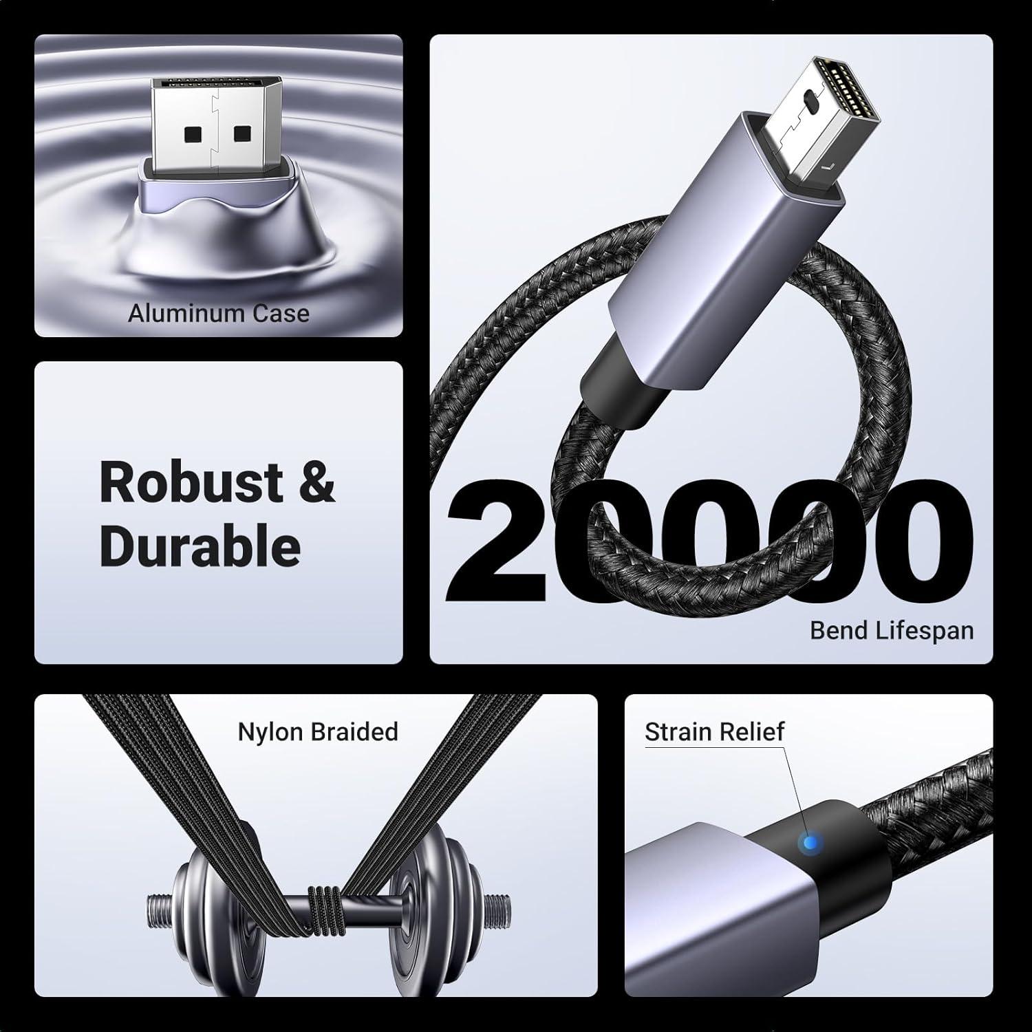 Nylon & Alu Case for Superior Durability: Braided nylon cable adds durability and strain relief making plug-and-unplug easier. Premium aluminum alloy case for greater heat dissipation. High-quality connectors ensure secure, high-speed data transmission. A thicker copper wire has maximum conductivity while minimizing signal loss. With an additional Velcro tie for travel, this thunderbolt to DisplayPort cable is the ideal length for home offices